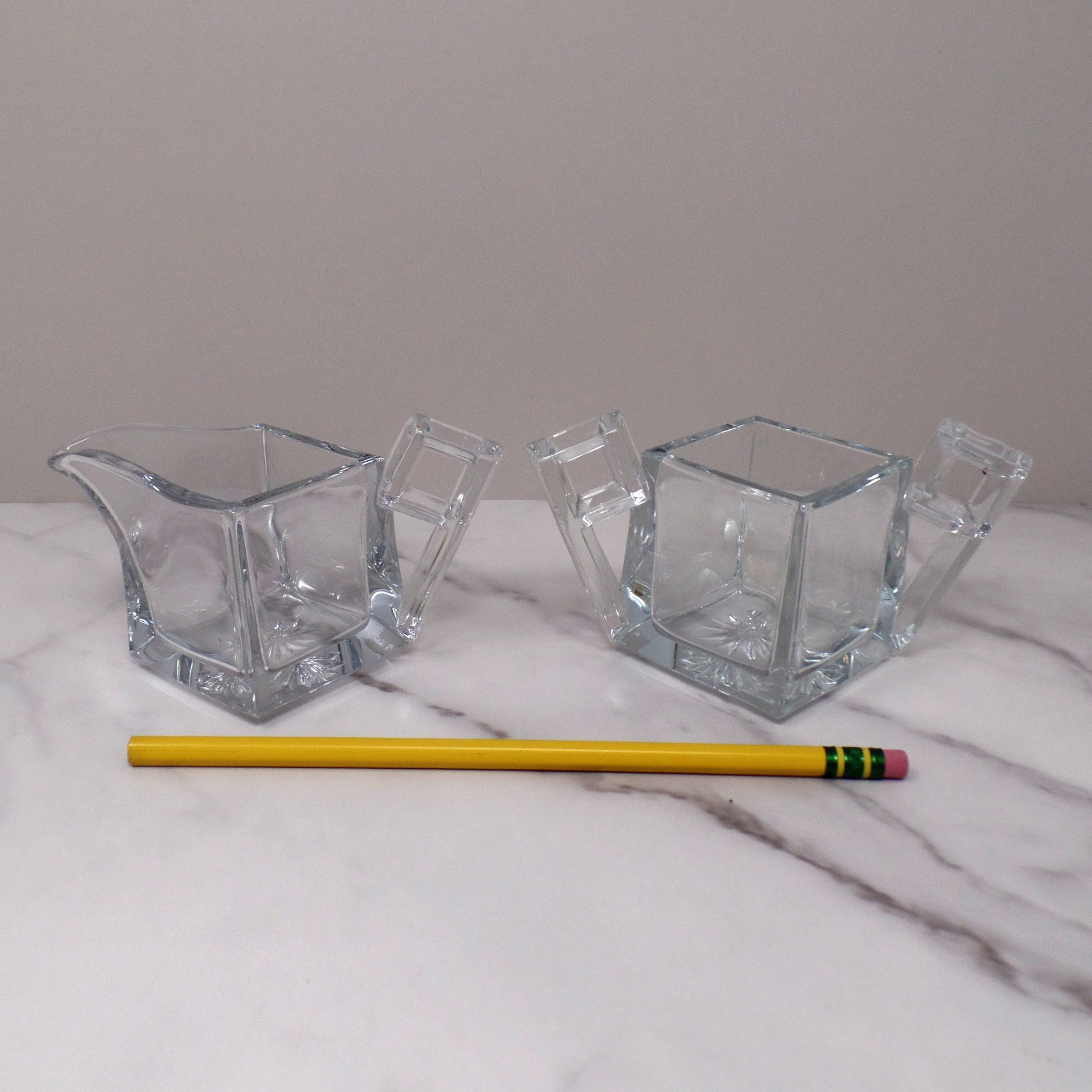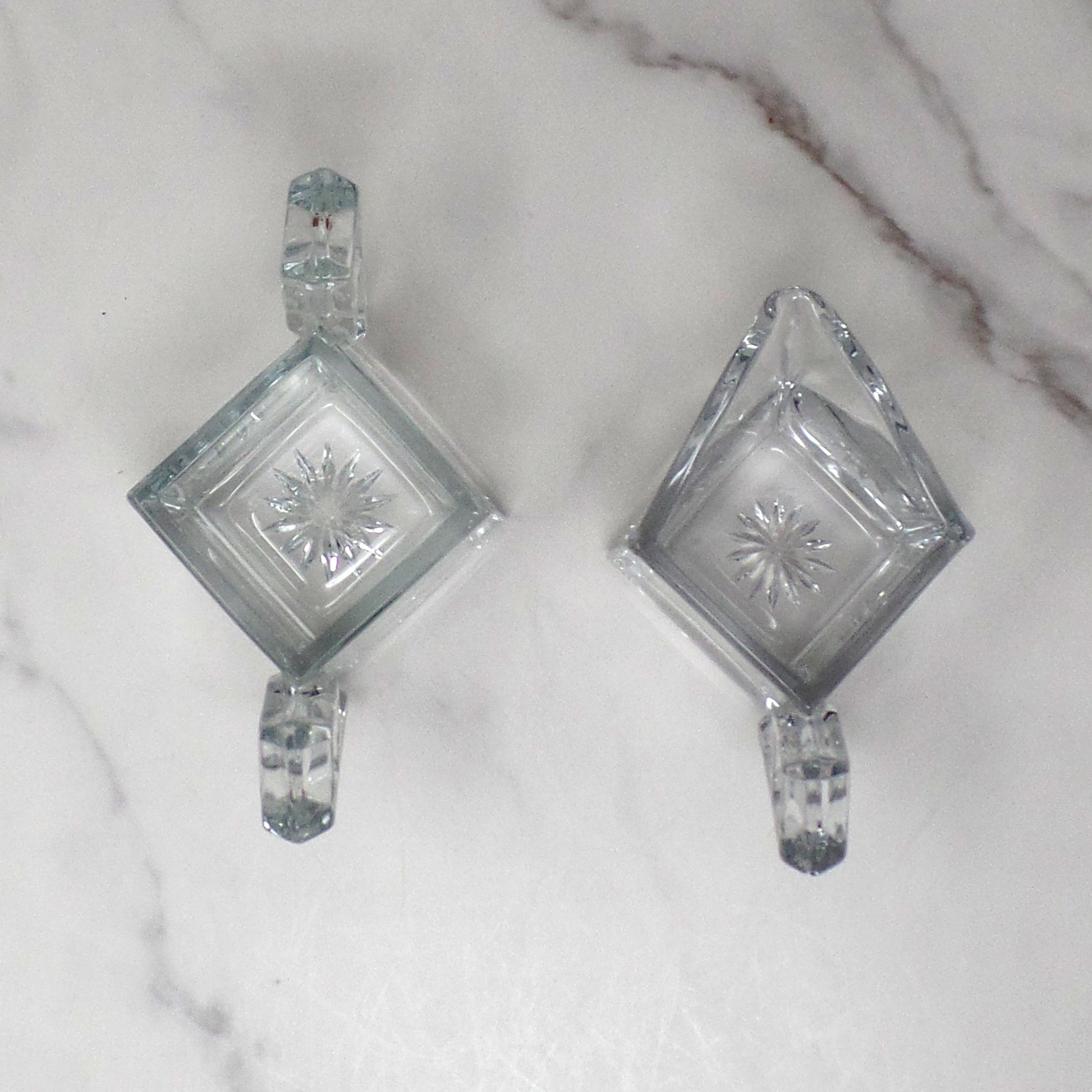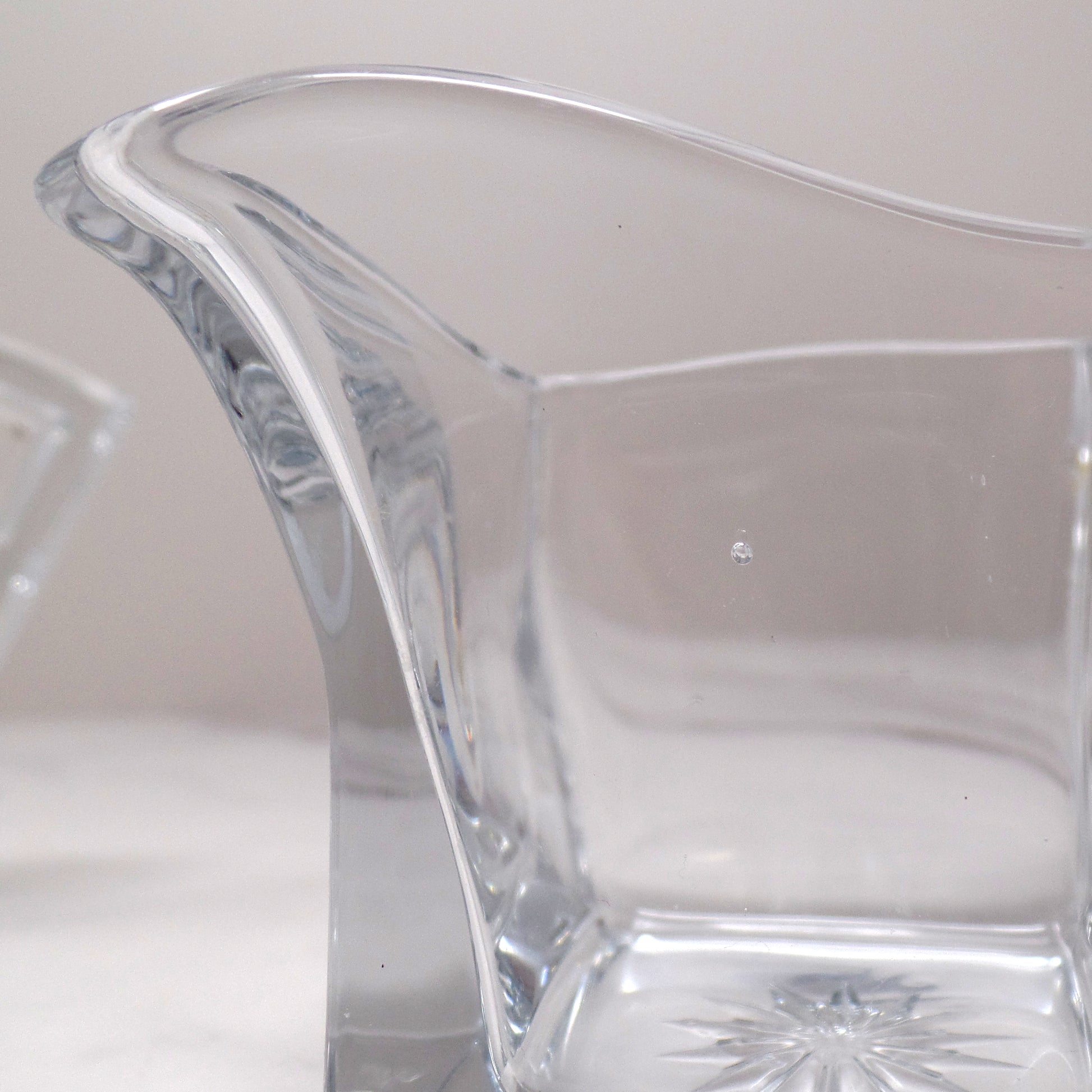 Antique Heisey glass Quator cream and sugar set. Made in the USA, circa 1912. Good vintage condition: There is a small scuff on the lower handle of the creamer. The sugar bowl has a small chip on the corner and two spots of scuffing along the top edge (see detail photos).