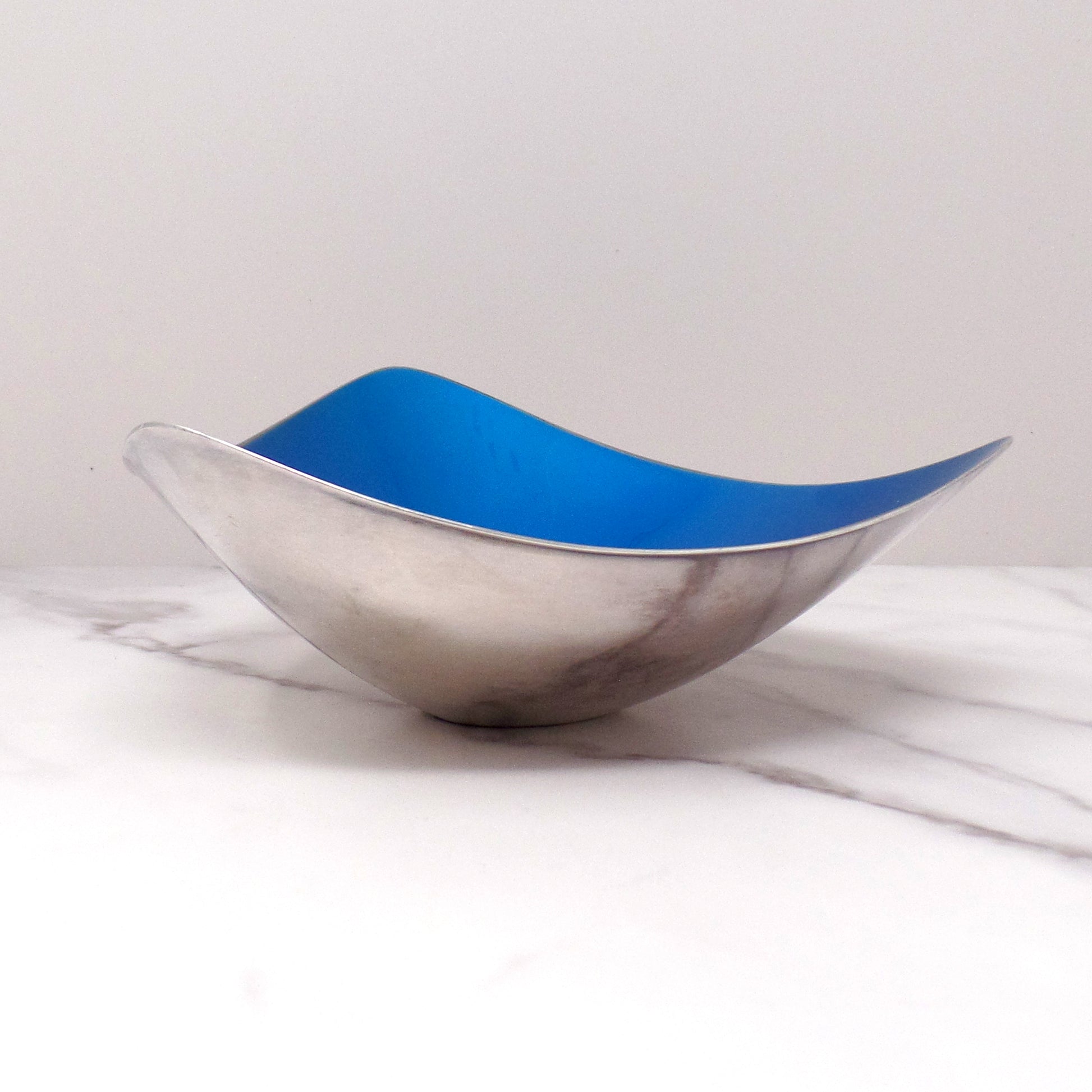 Vintage mid-century modern Reed & Barton vibrant blue enamel over silverplate triangular bowl (241), made in the USA in the 1960s. Good vintage condition: various scratches from use. A few tarnish spots on silverplate and two dark spots on enamel (see detail photos). Original label still on the bottom.