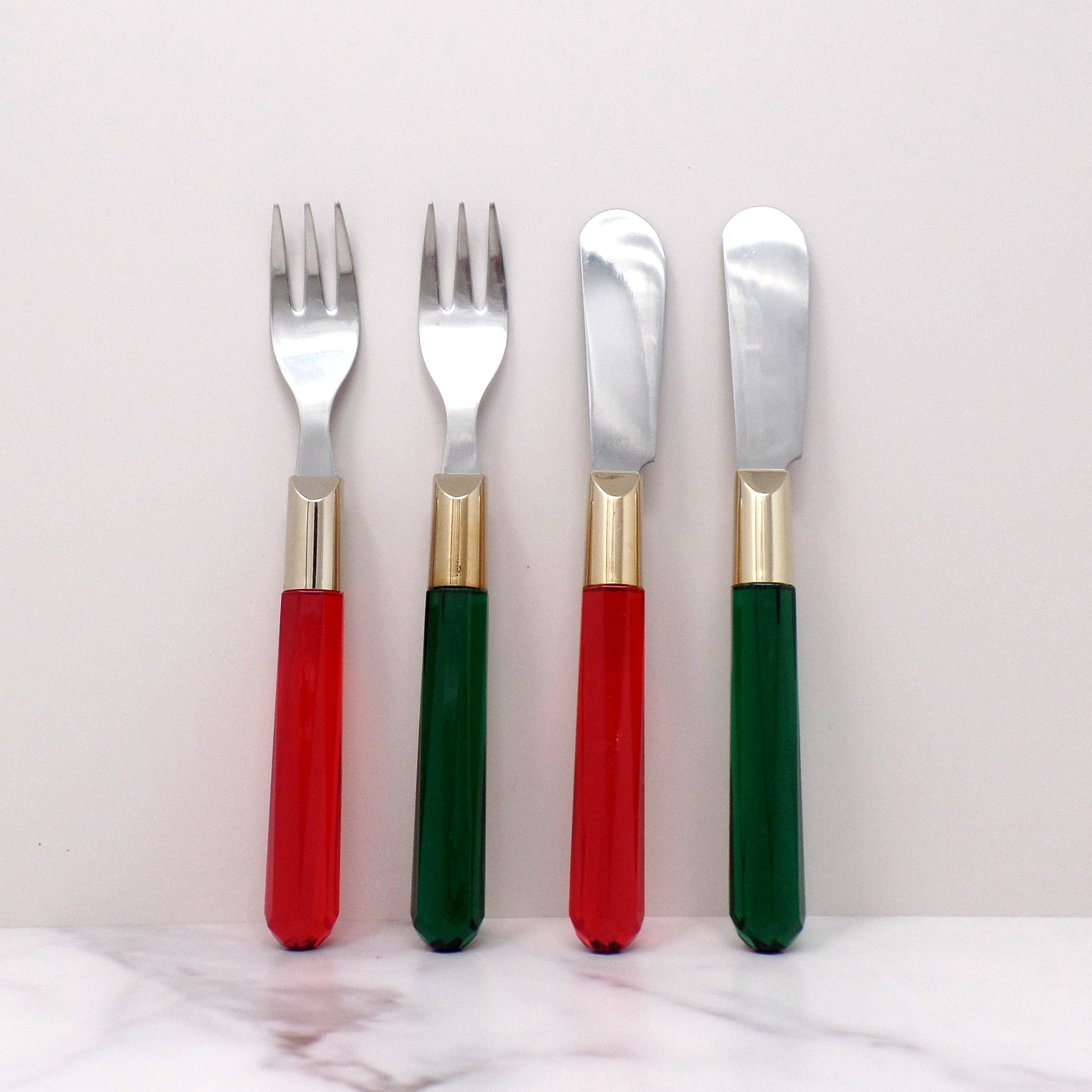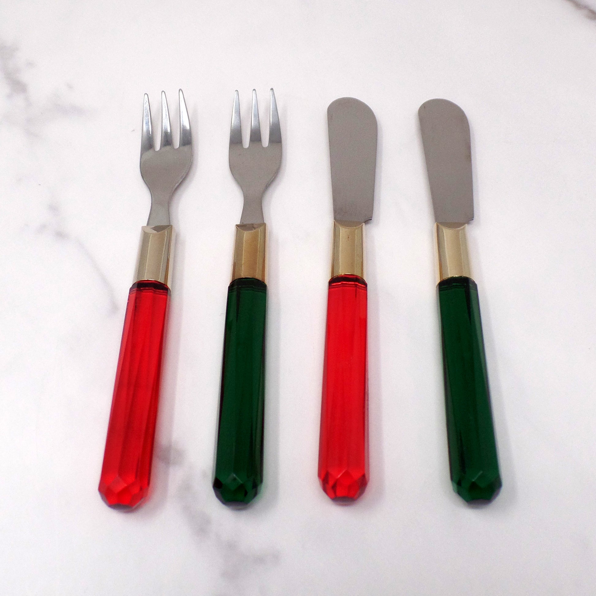 Vintage Red & Green Acrylic-handled Stainless Steel Charcuterie / Appetizer Cheese Spreaders & Forks, set of 4 (1980s)