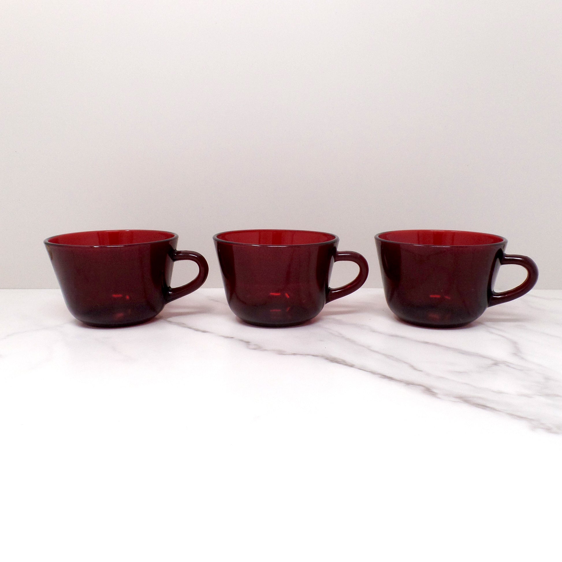 Set of 3 Ruby Red glass mugs from Anchor Hocking, made in the USA in the 1960s. In very good vintage condition.