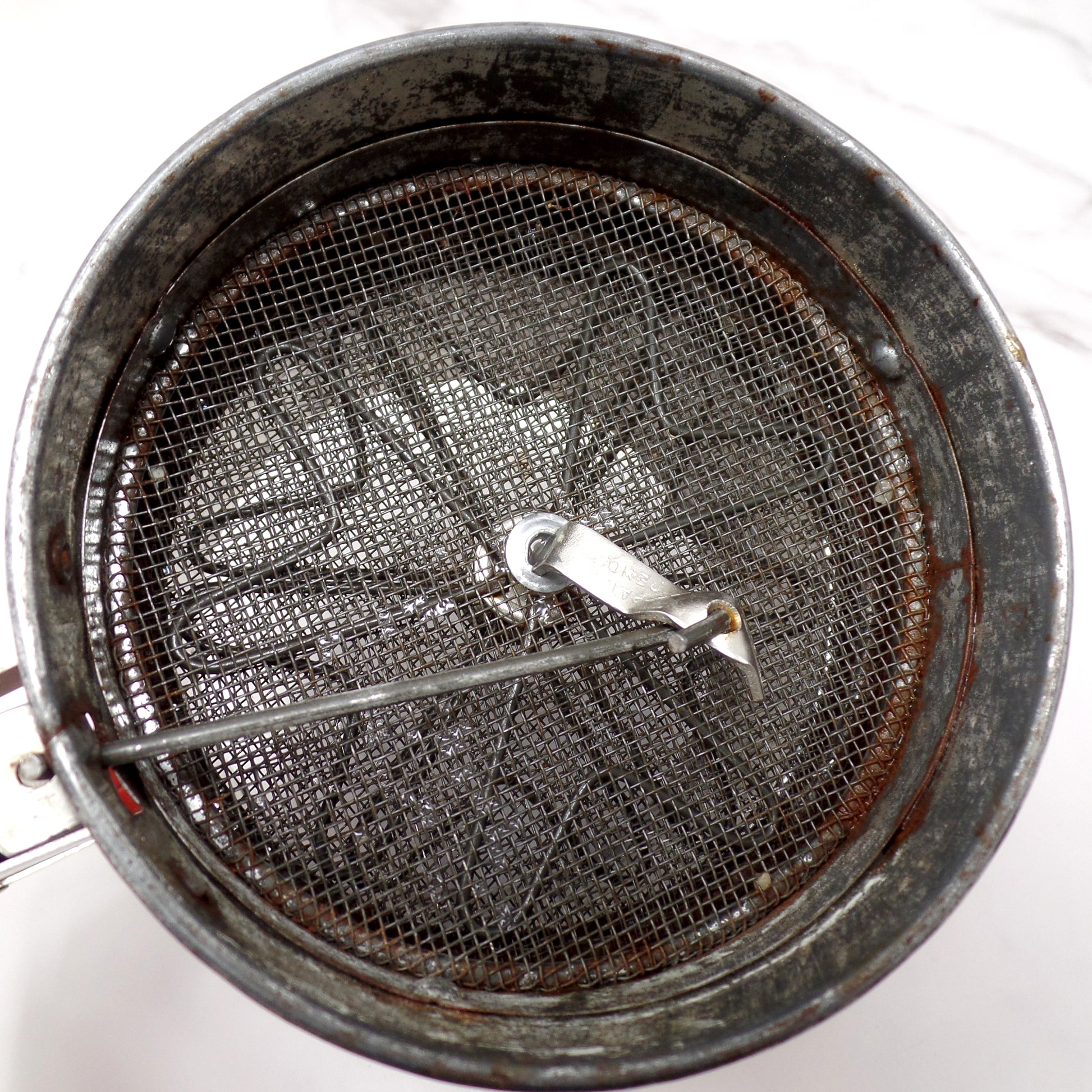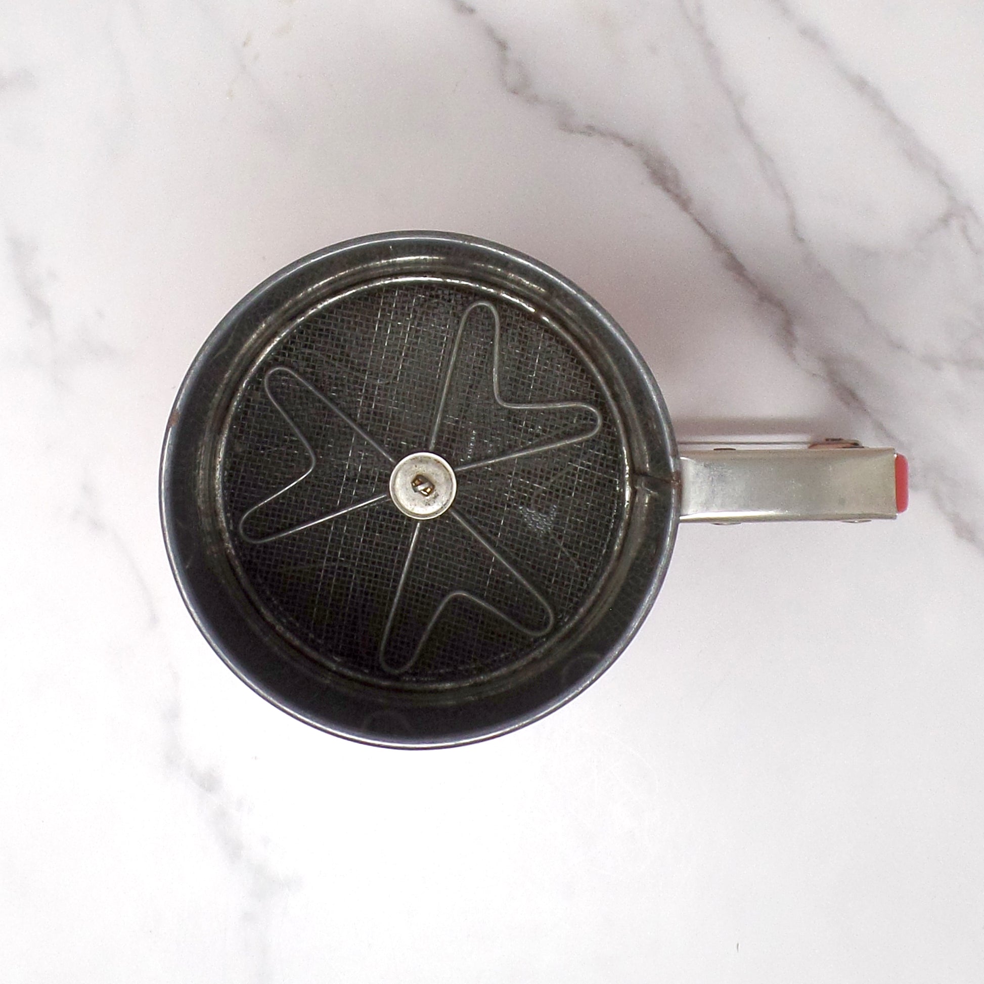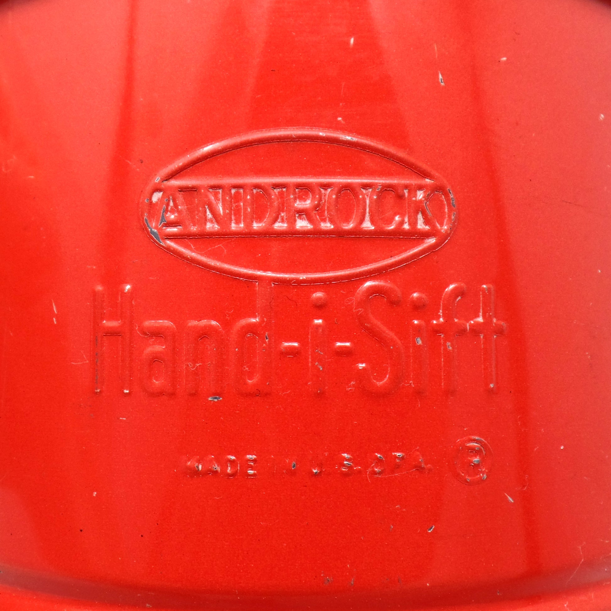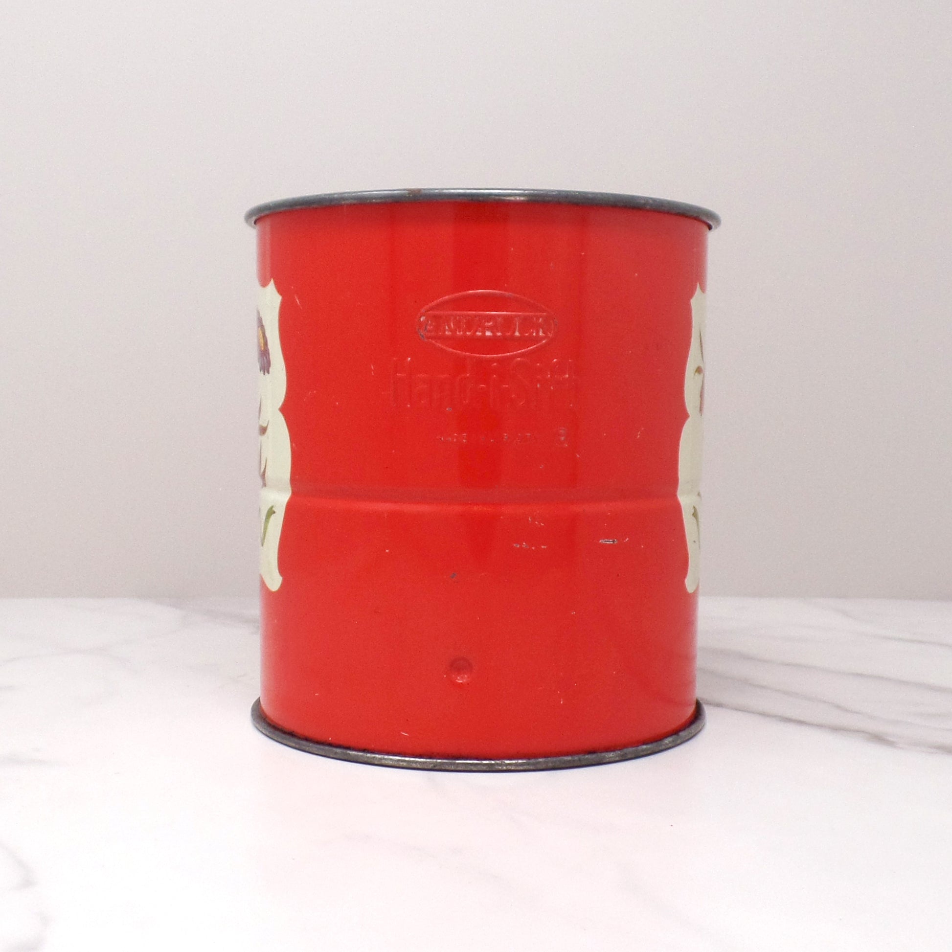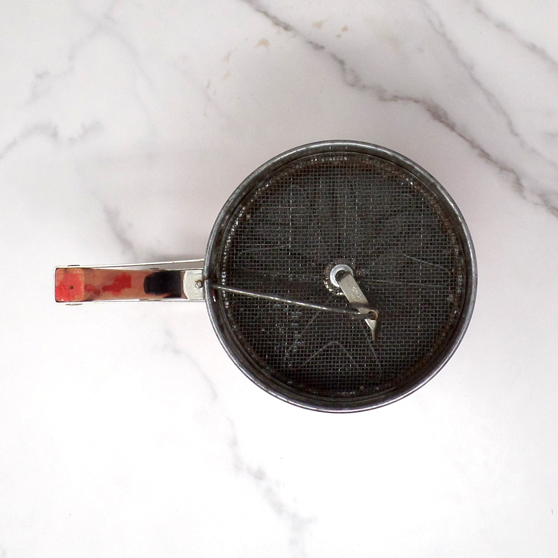 Fair vintage condition: the red paint on the handle has flaked off, and it also has some scratches and general patina from age and use (see detail photos). The sifting mechanism still works well.