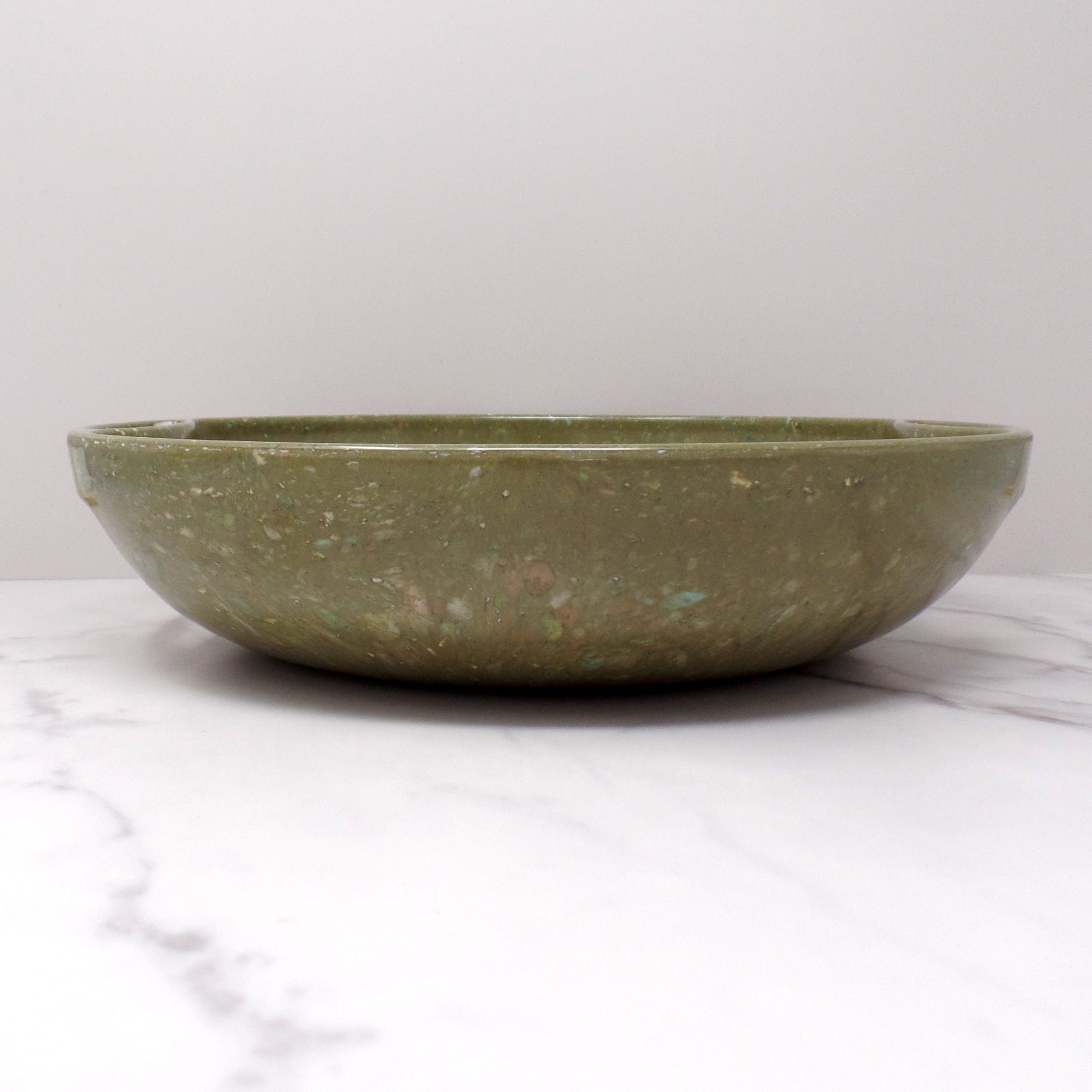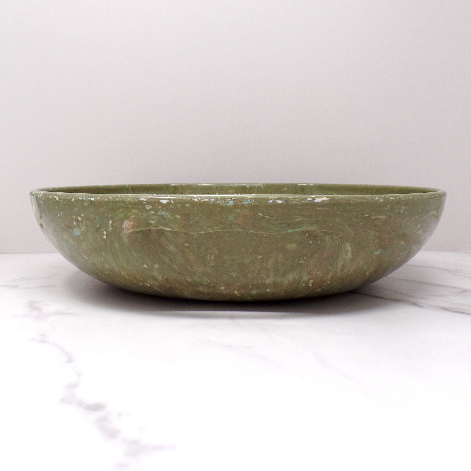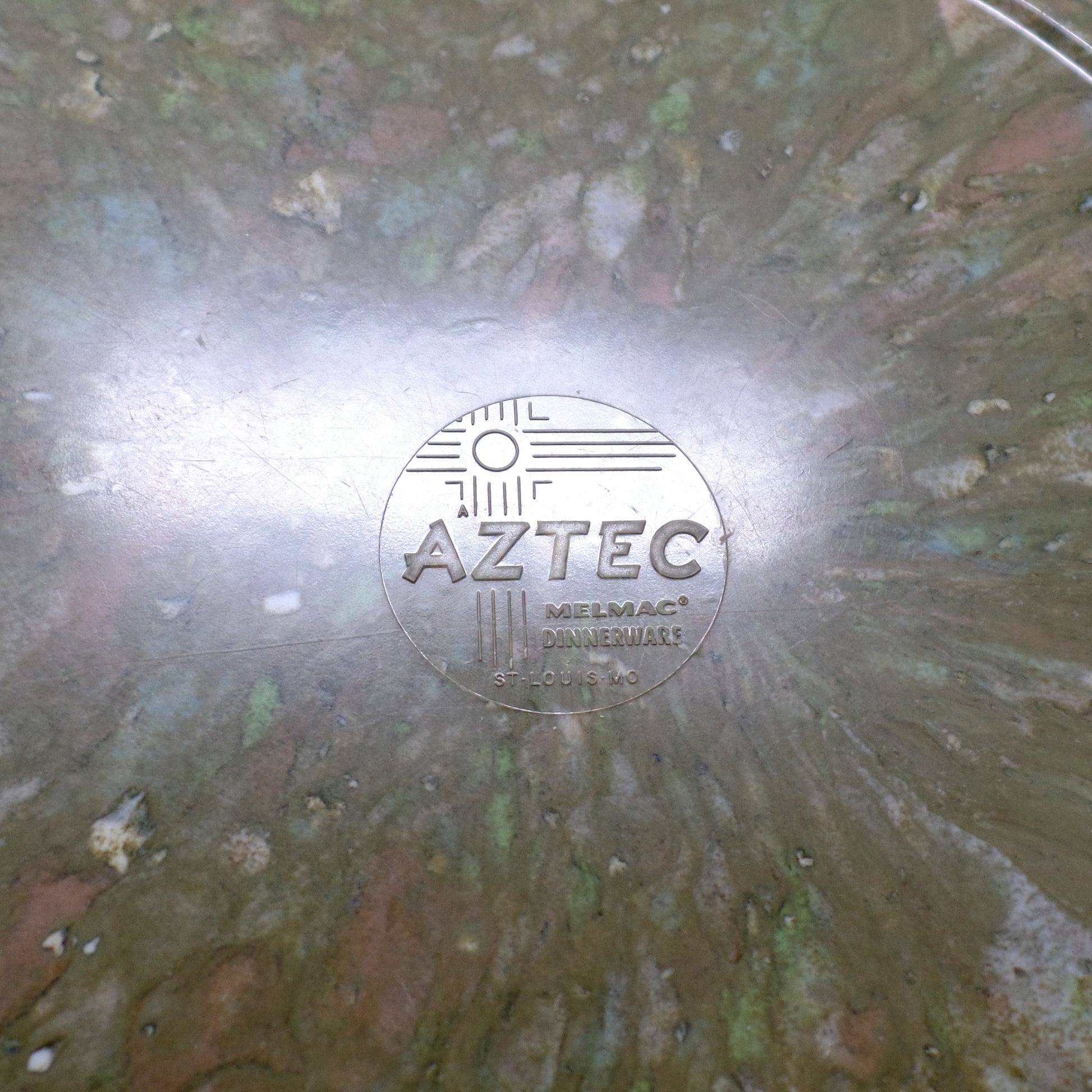 Vintage Aztec melamine / melmac round salad serving bowl in olive green confetti. Made in the USA in the 1960s. Very good vintage condition with some scratches from use.