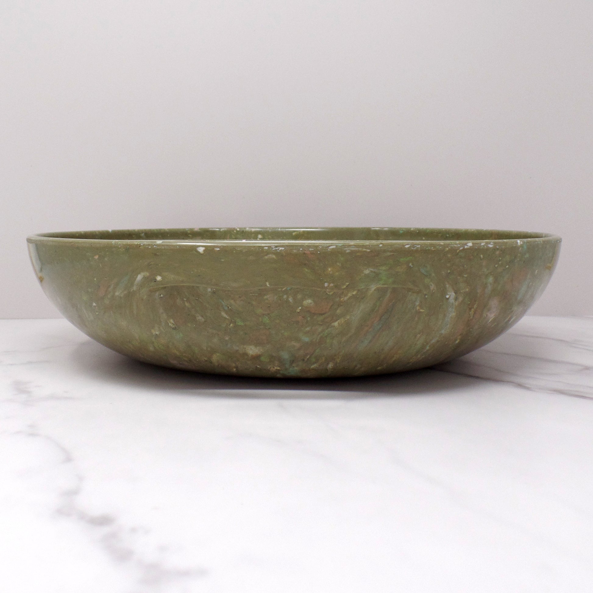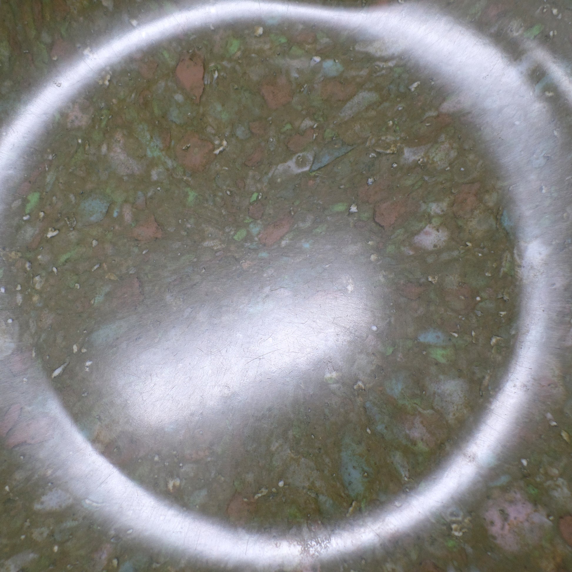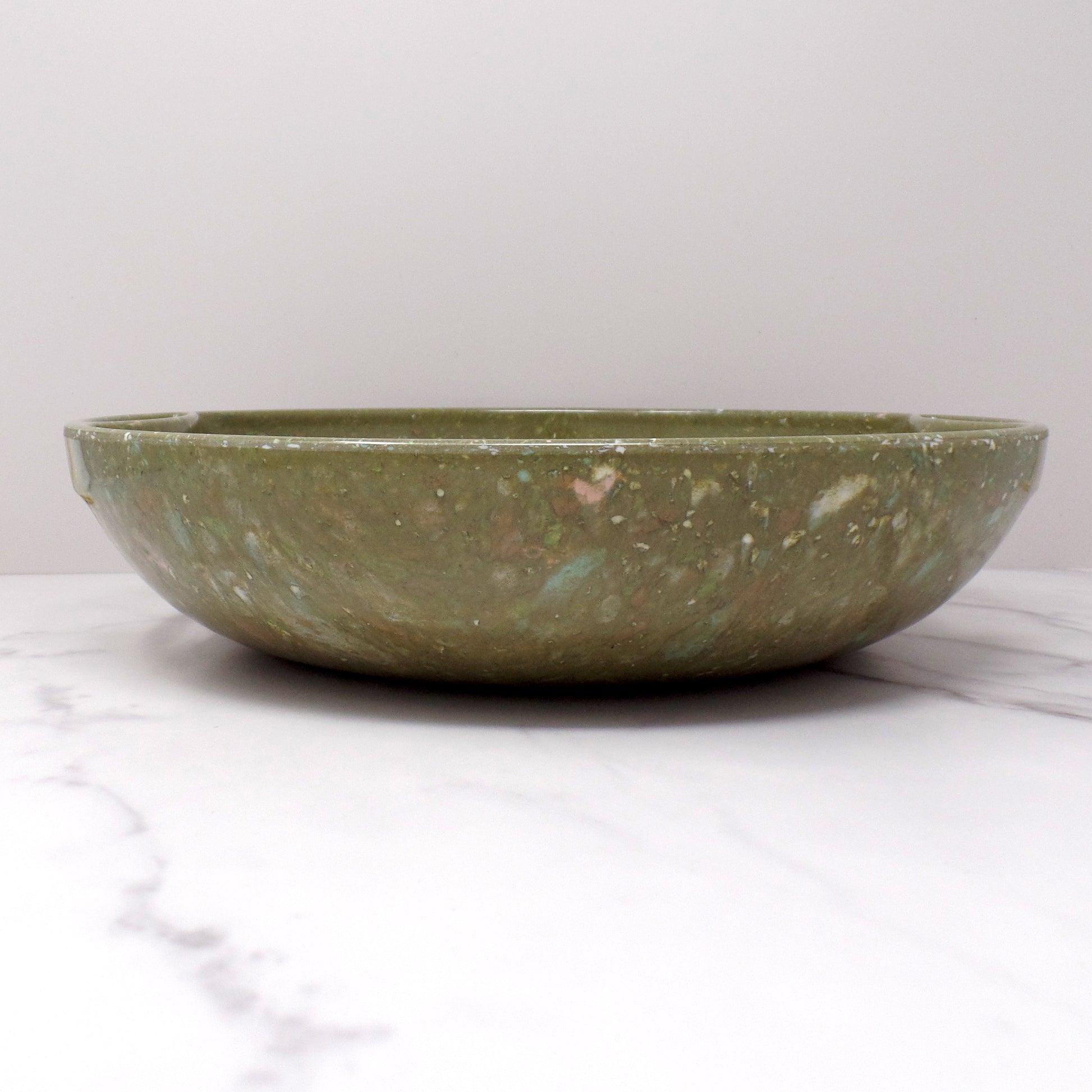 Vintage Aztec melamine / melmac round salad serving bowl in olive green confetti. Made in the USA in the 1960s. Very good vintage condition with some scratches from use.