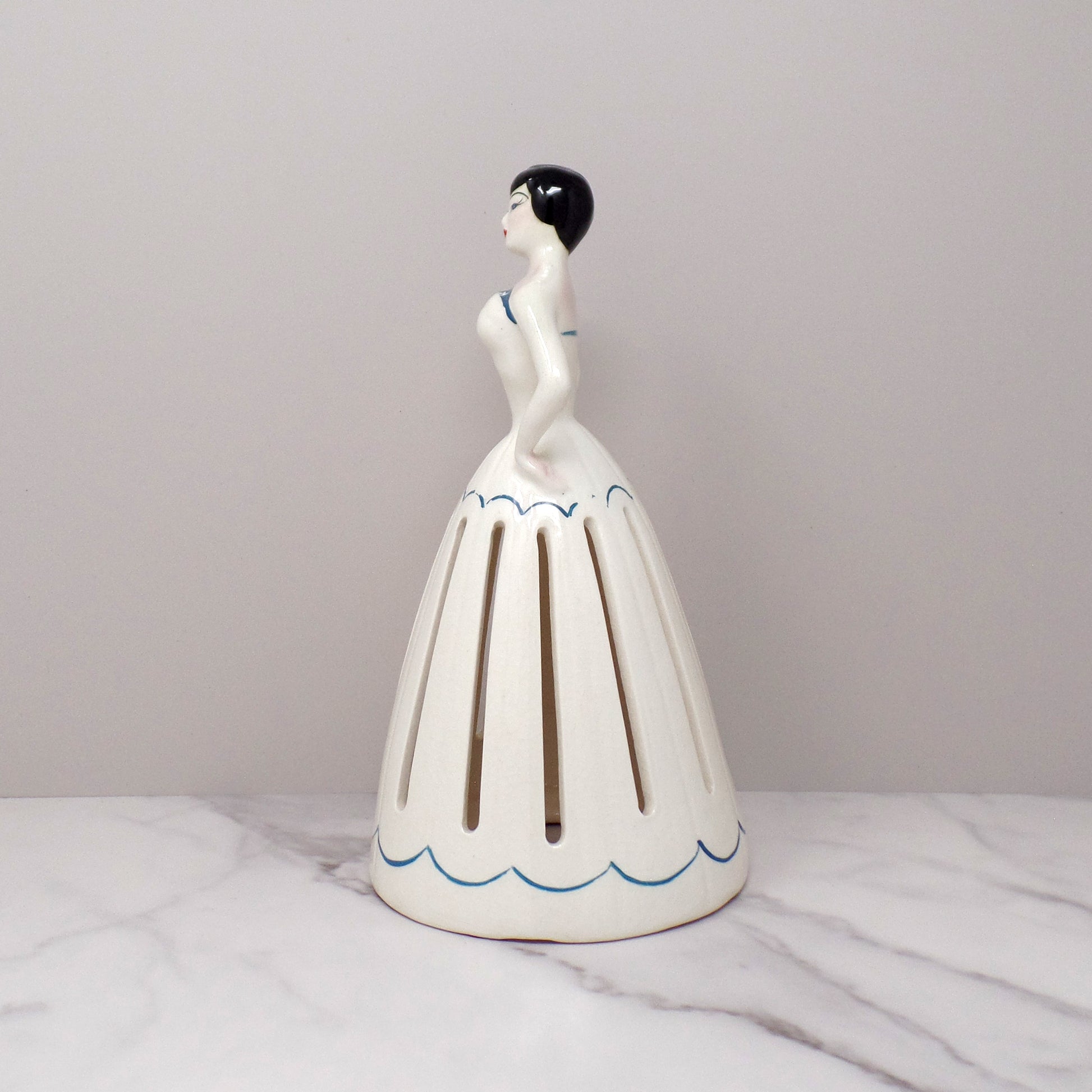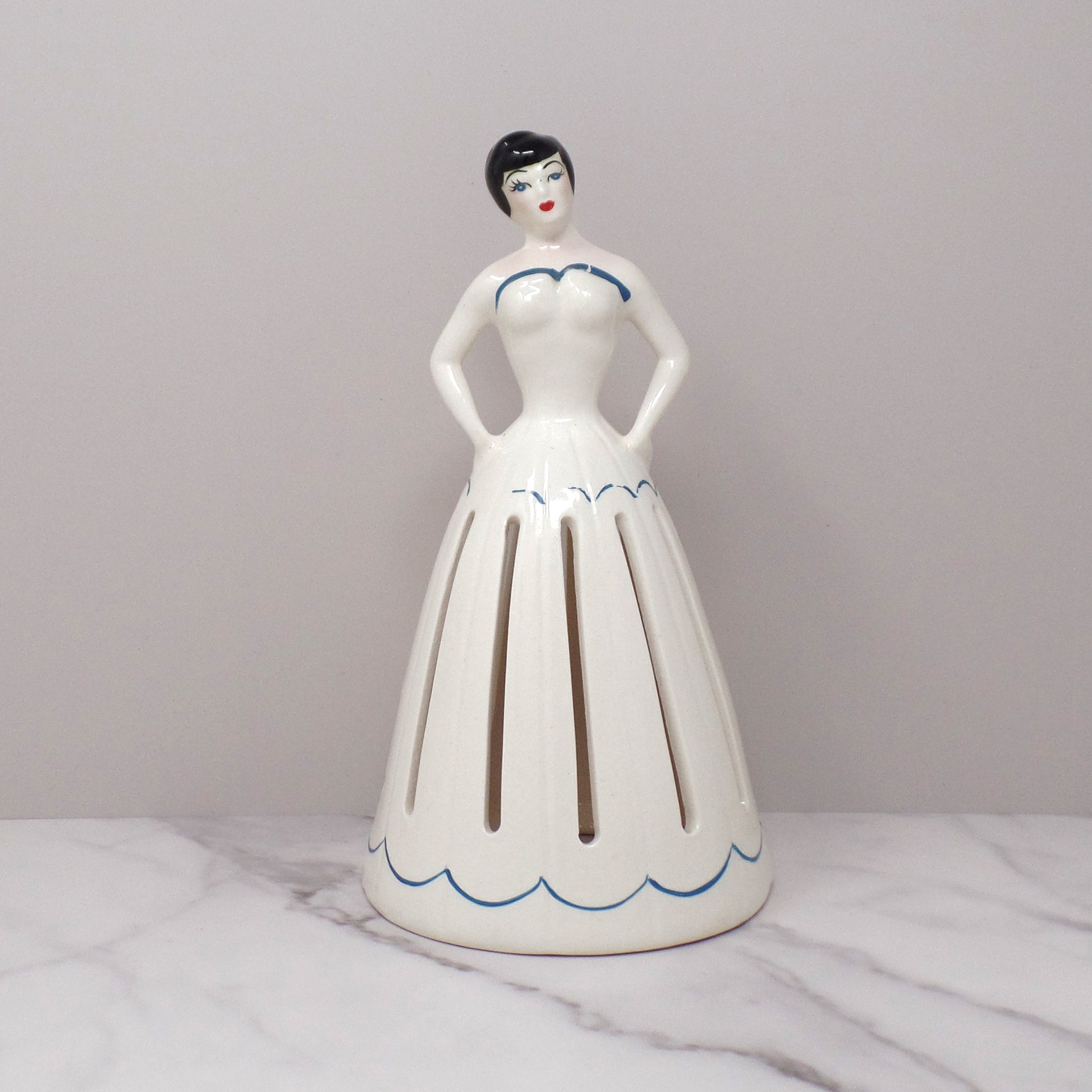Vintage ceramic napkin girl, probably from the 1950s. Unknown maker. Folded napkins would be placed in the the slots of her dress to fill out her skirt as a lovely display for dispensing napkins at the table or party buffet.