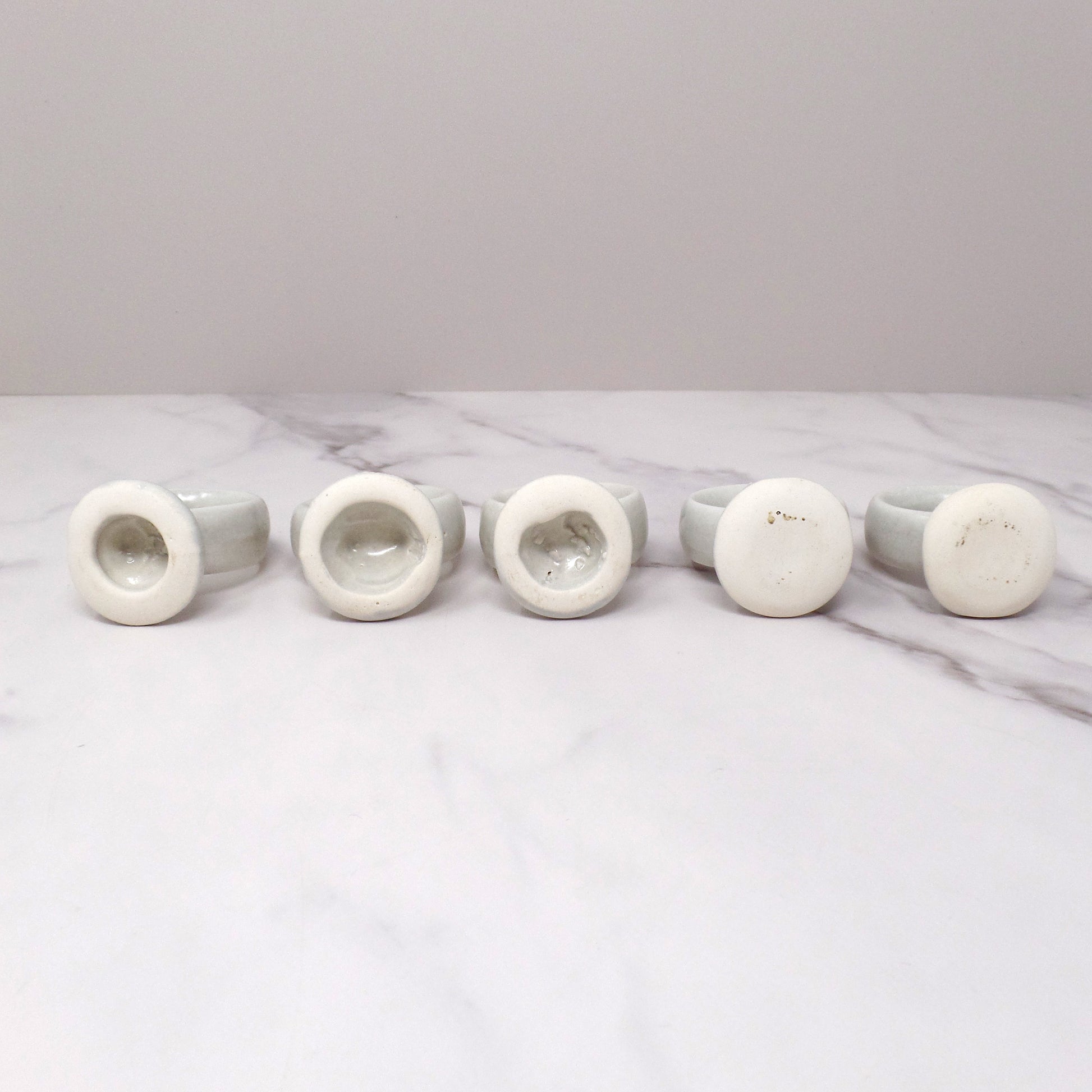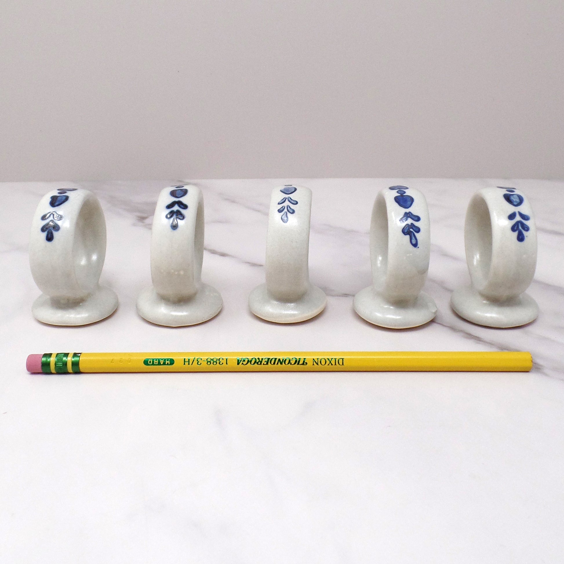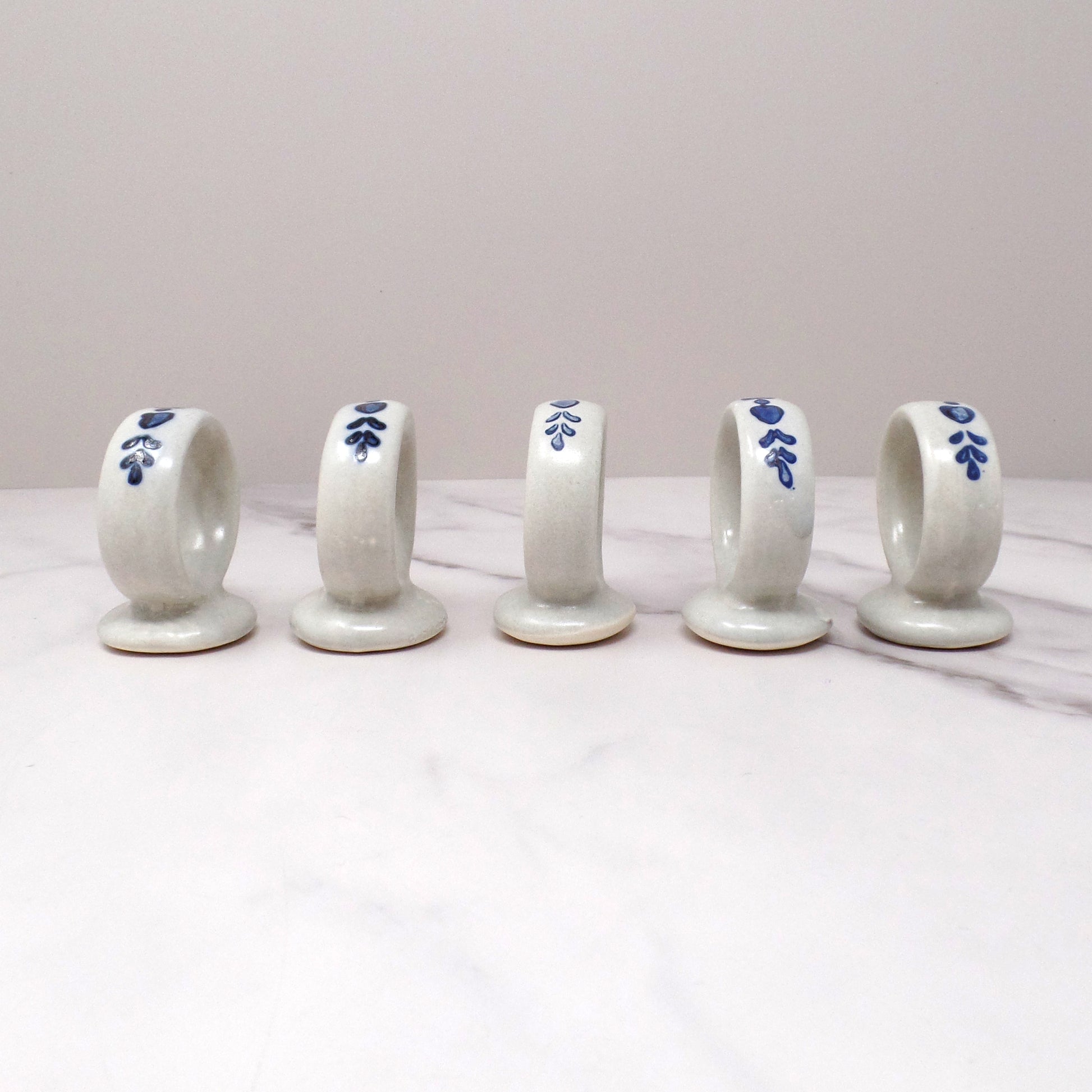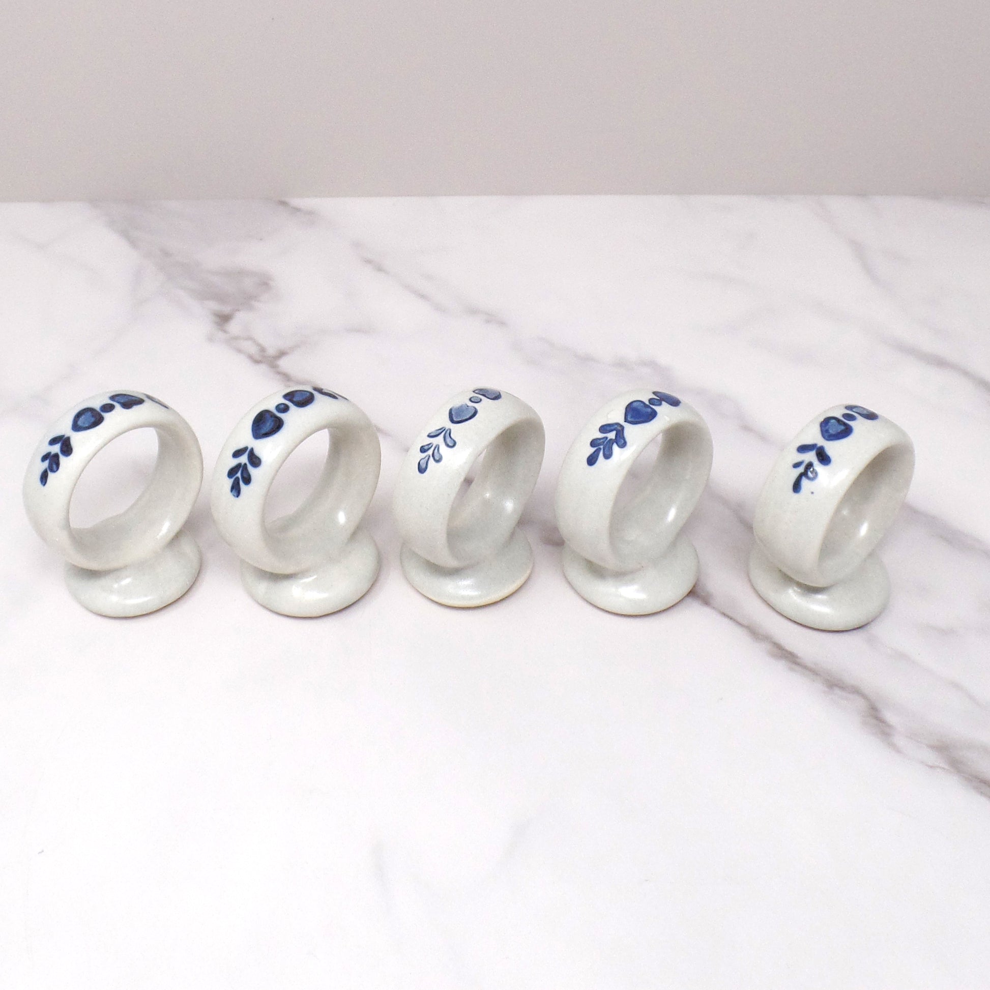 Vintage ceramic set of 5 napkin rings from Pfaltzgraff in the Yorktowne pattern. Made in the USA in the 1980s-1990s. Good vintage condition: no chips, cracks, scratches, utensil marks, or crazing on glaze. Three are the open-bottom variety, and two have a closed bottom.