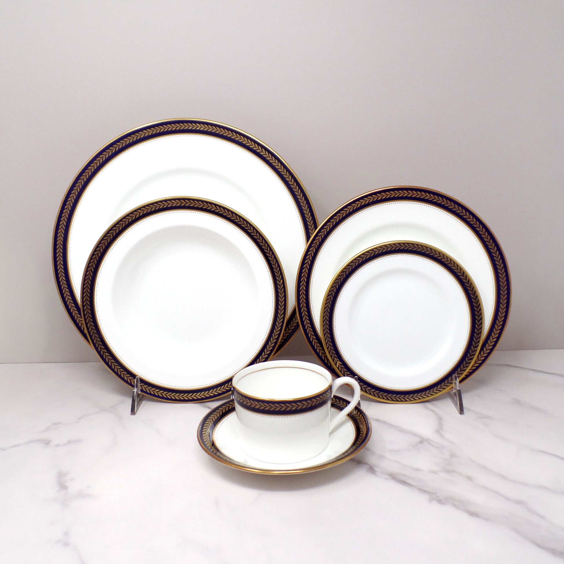 Elegant vintage Coalport bone china Blue Wheat 6-piece place setting. Vibrant and deep cobalt blue band with gold edging and pattern. Includes one each of dinner plate, rimmed soup bowl, salad plate, bread & butter / dessert plate, flat cup, and saucer. Made in England in the time period of 1972-93. In very good vintage condition.