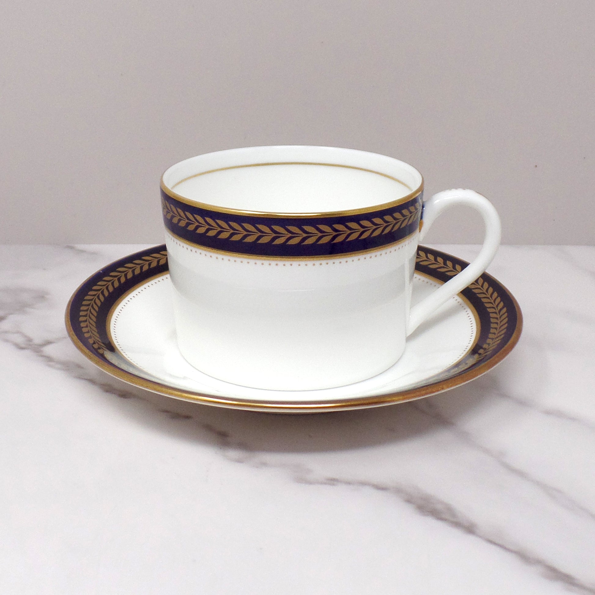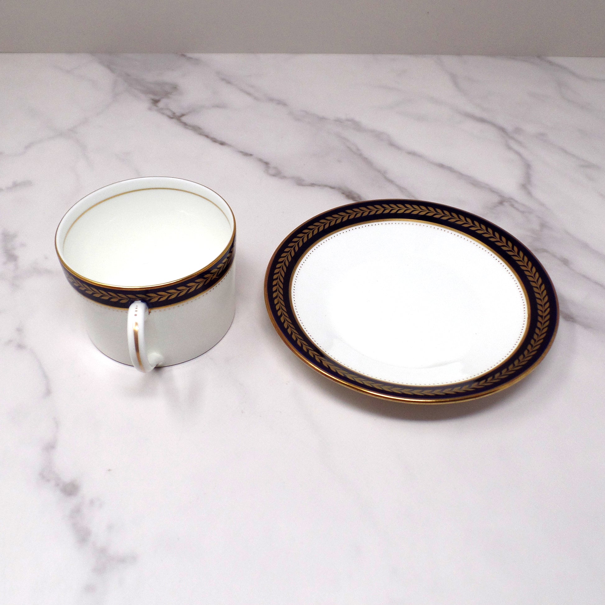 Elegant vintage Coalport bone china Blue Wheat flat cup and saucer. Vibrant and deep cobalt blue band with gold edging and pattern. Made in England in the time period of 1972-93. In very good vintage condition.