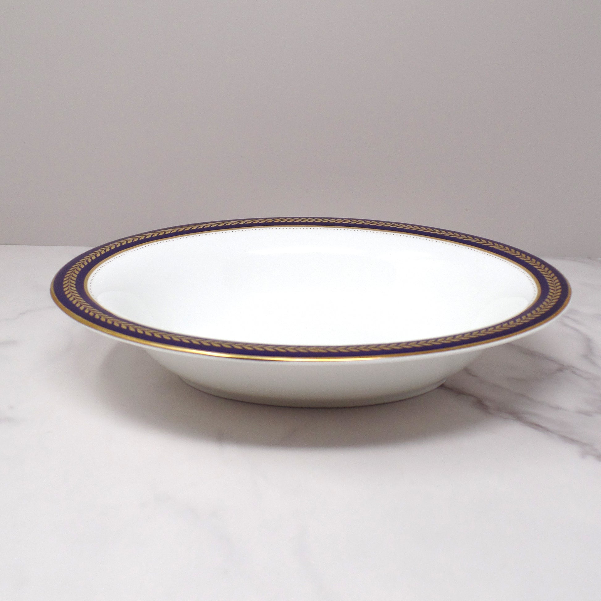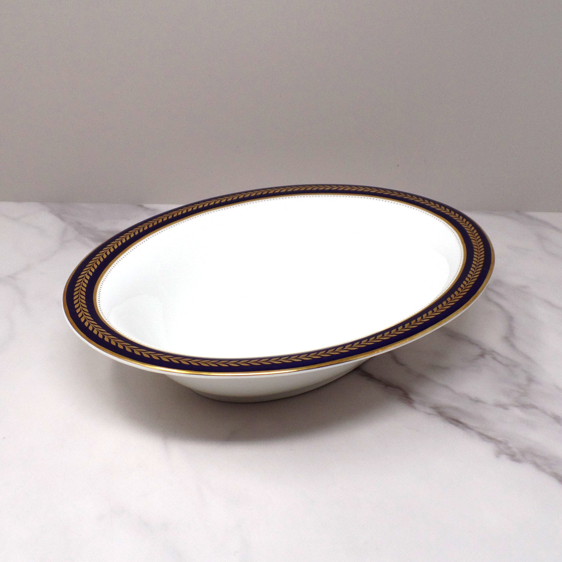 Elegant vintage Coalport bone china Blue Wheat oval vegetable serving bowl. Vibrant and deep cobalt blue band with gold edging and pattern. Made in England in the time period of 1972-93. In very good vintage condition.