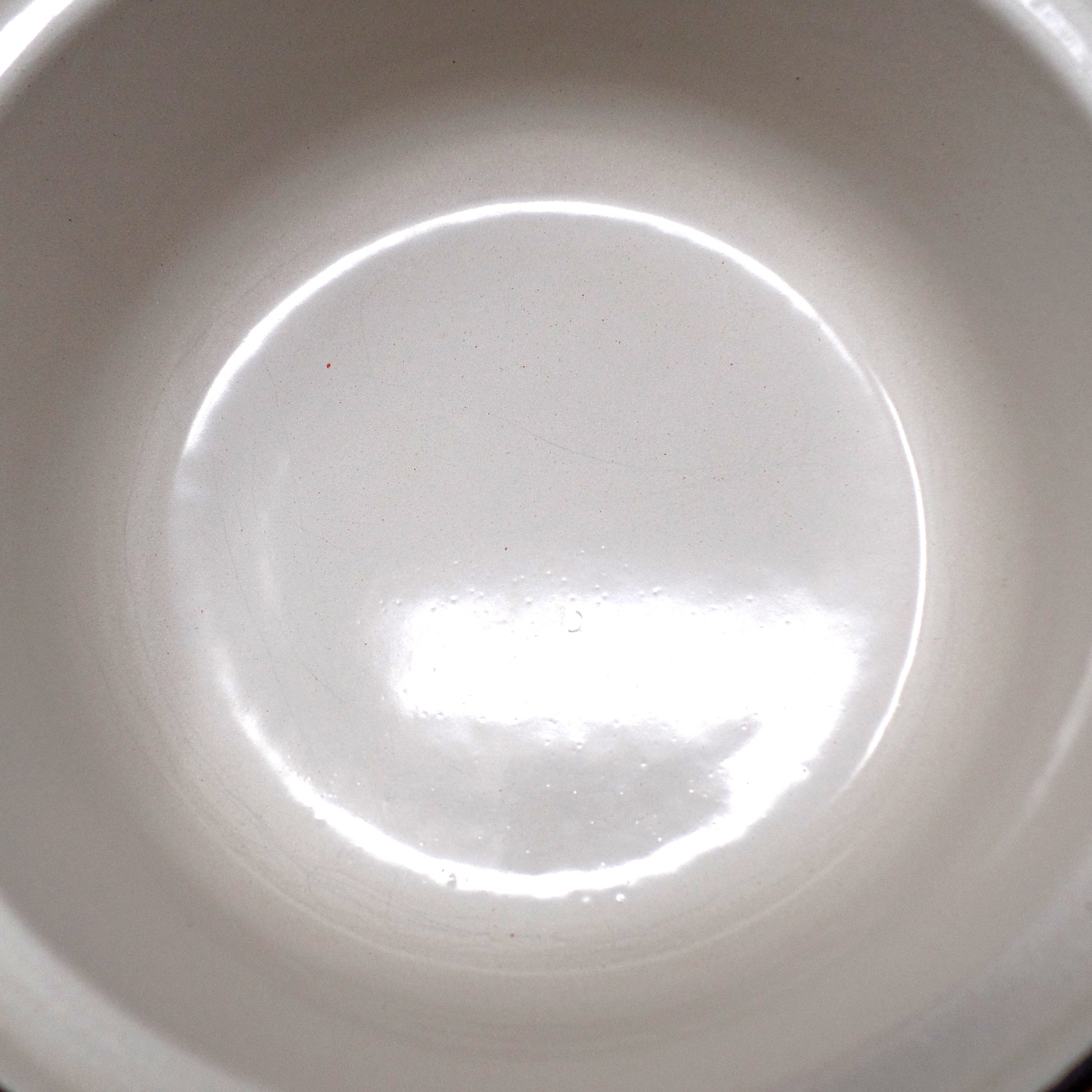 Very good vintage condition: Still has original label on the side. Enamel is bright and shiny inside and out. Very slight utensil marks on inside of pan. There is one scrape mark on the handle of the lid where it looks like it was stored with the lid upside down on the pan and the edge of the pan scuffed it (see detail photo).