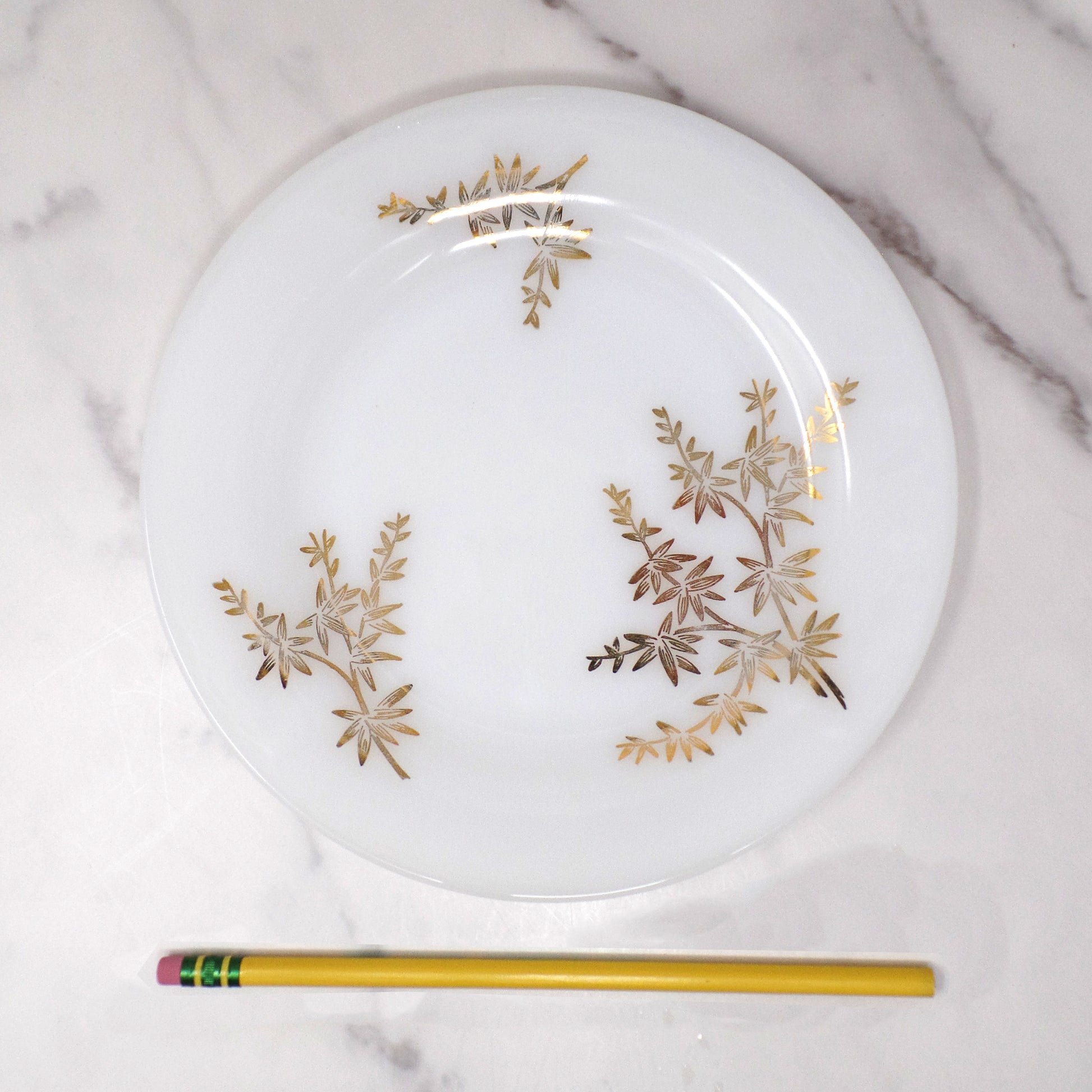 Vintage Federal Glass Golden Glory 7 3/4" salad plate, made in the USA in the 1960s. Good vintage condition with just some very slight fading to the gold print (see detail photo).