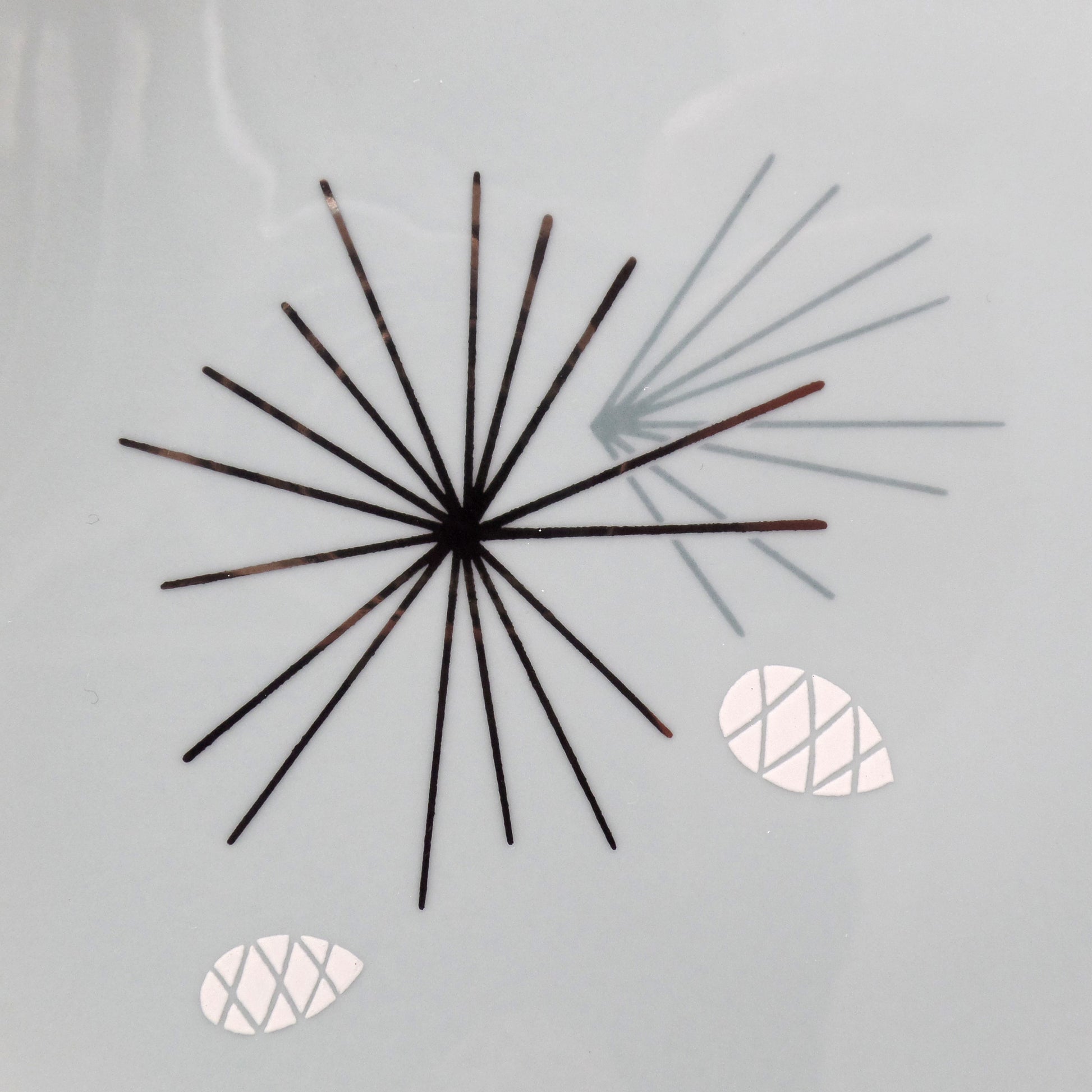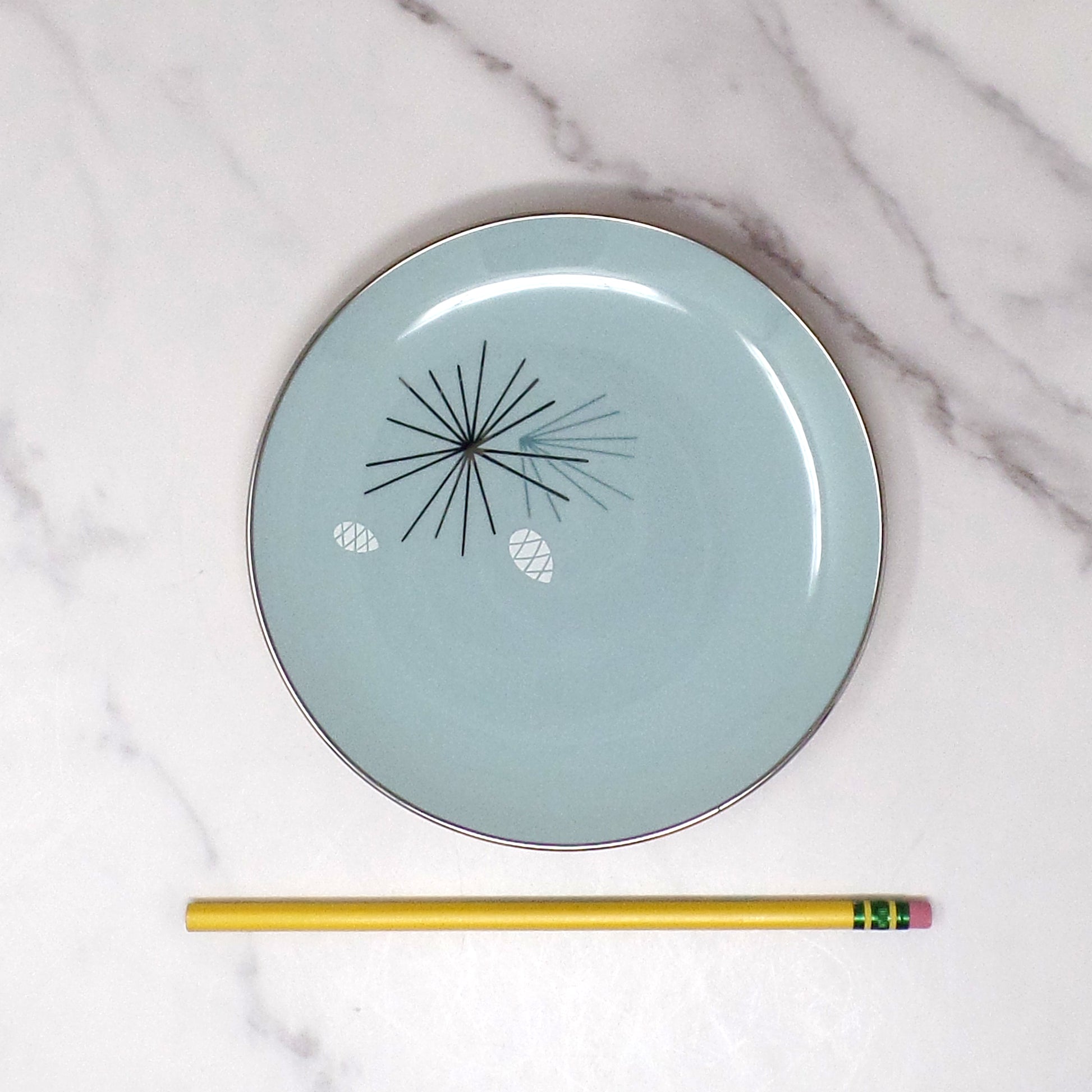 Absolutely gorgeous vintage Franciscan China mid-century modern Silver Pine bread & butter / dessert plate. Made by Gladding, McBean & Co. in California, USA in the time period of 1955-58, based on the backstamp. In excellent vintage condition.