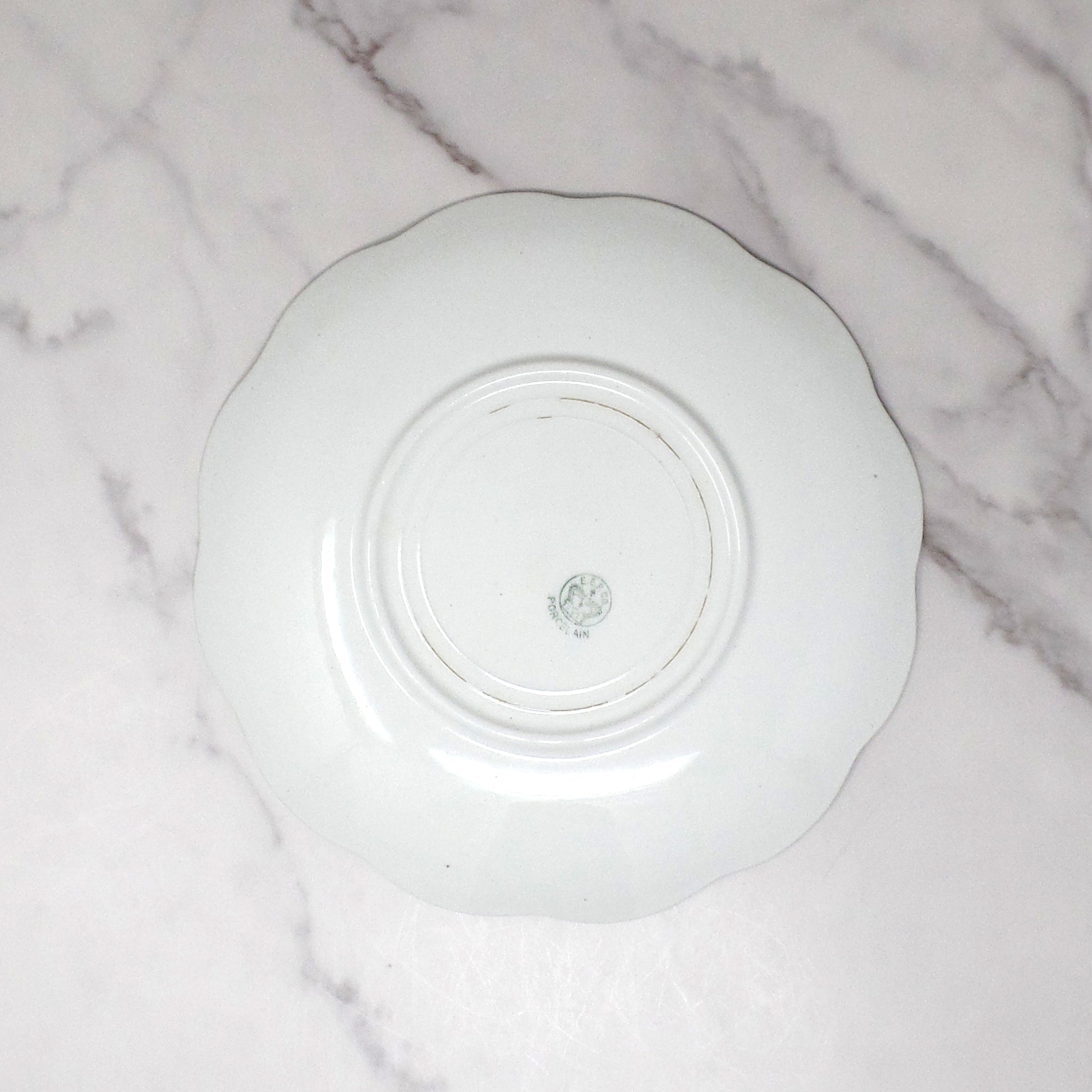 Antique porcelain plate with iridescent glaze, scalloped edge, and lovely transferware pattern of cherries and cherry blossoms. Made in Ohio, USA by East End Pottery Co. in 1894-1910. In good vintage condition, especially for the age. There are a few surface scratches (see detail photos).