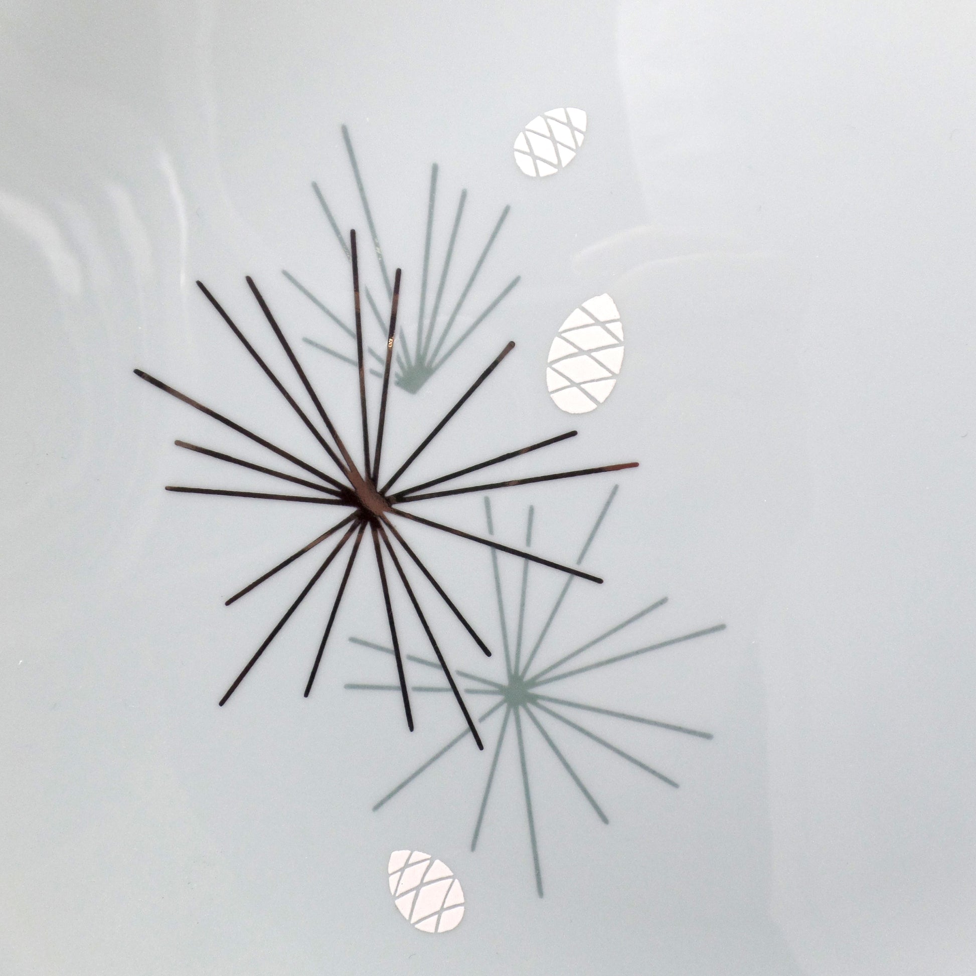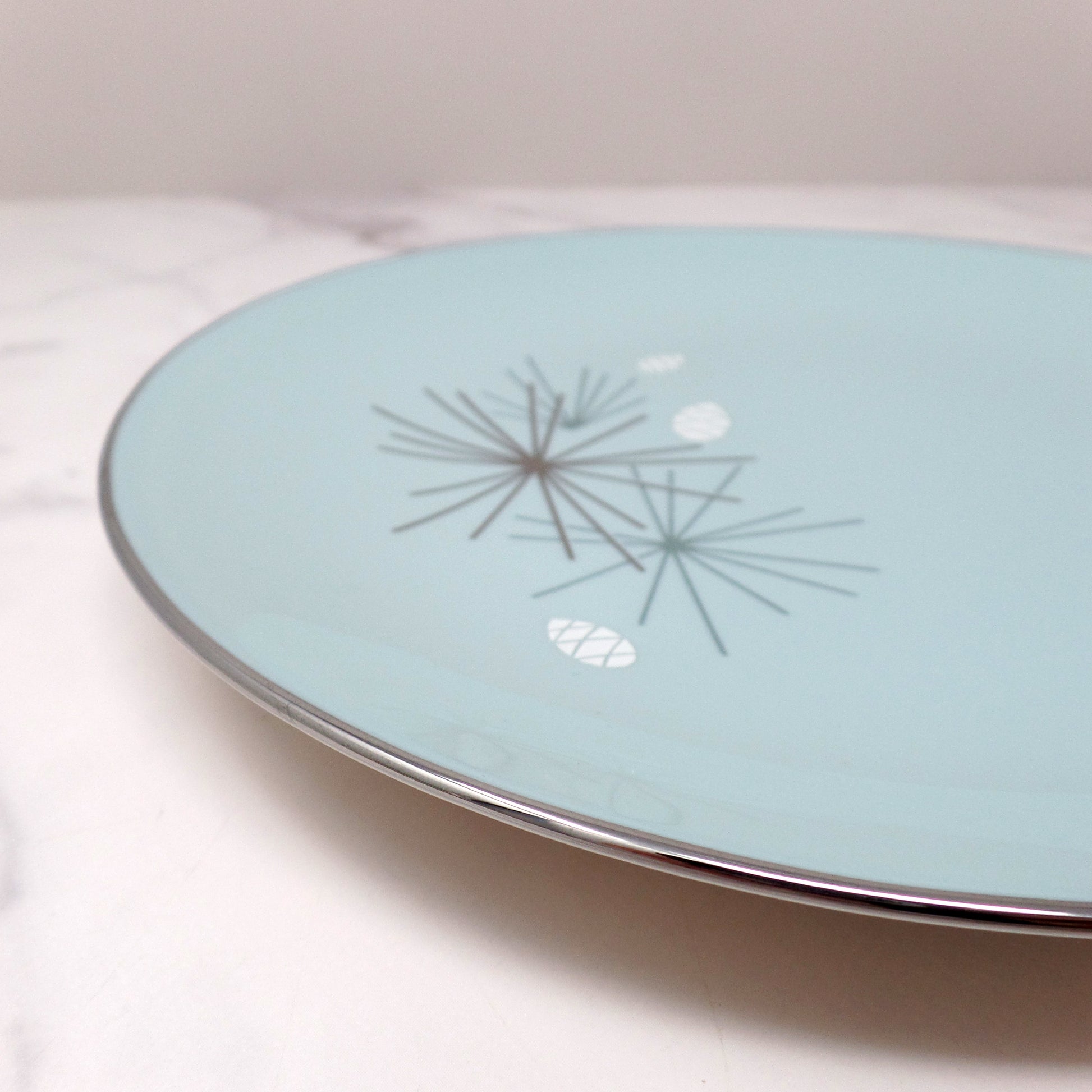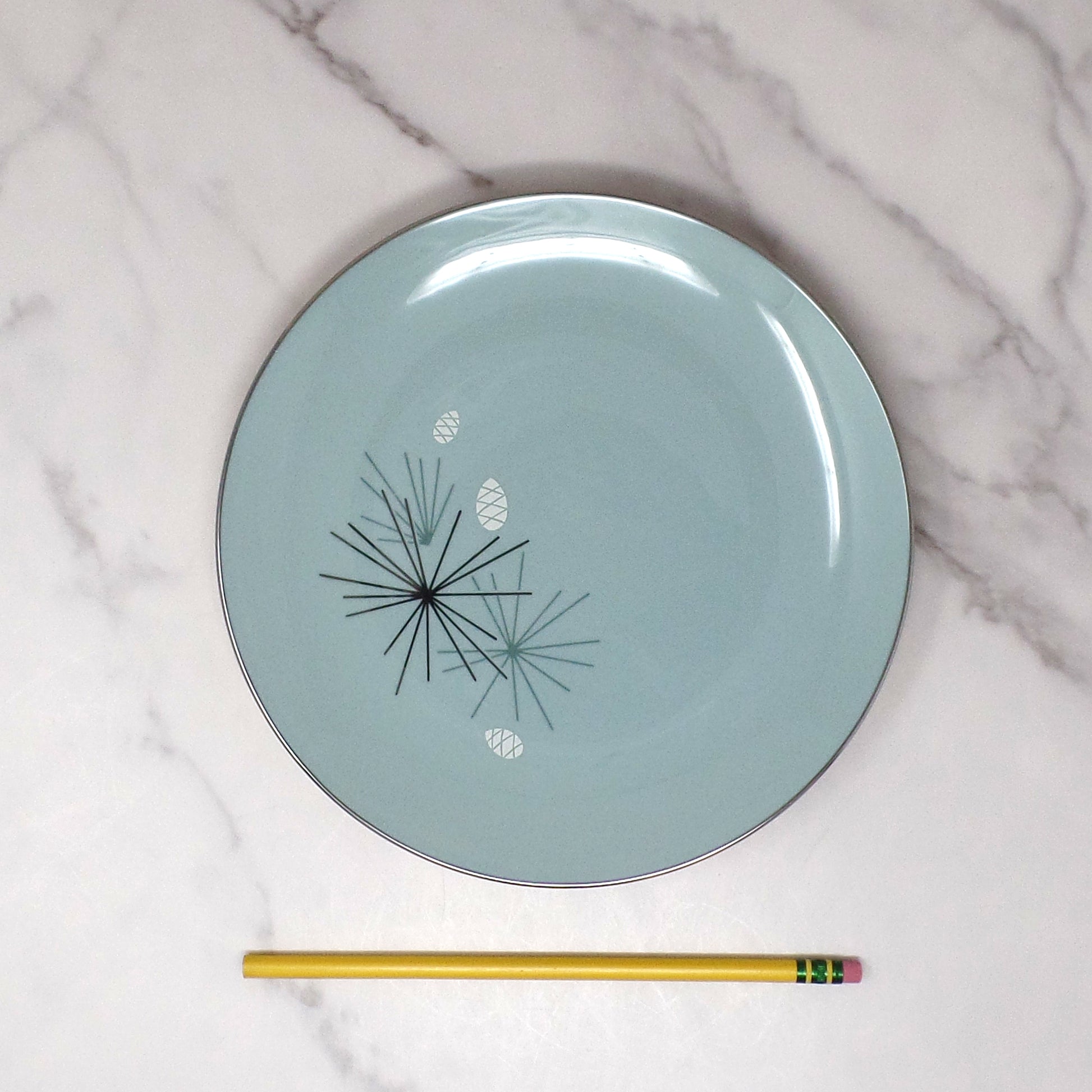Absolutely gorgeous vintage Franciscan China mid-century modern Silver Pine salad plate. Made by Gladding, McBean & Co. in California, USA in the time period of 1955-58, based on the backstamp. In excellent vintage condition.