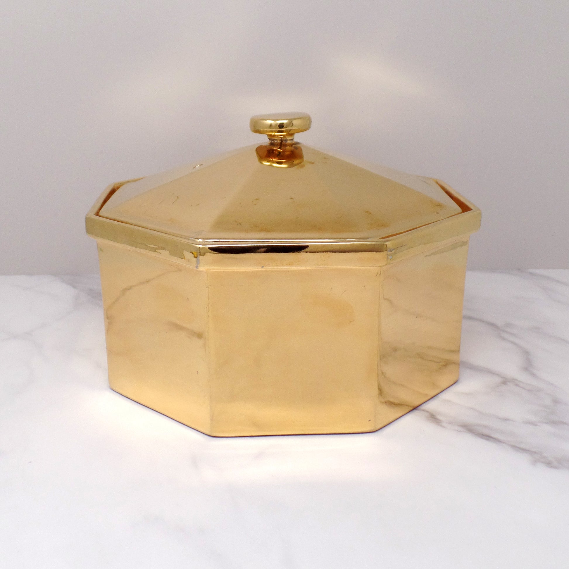 Vintage Hall Golden Glo lidded 2.5 qt ceramic octagonal casserole dish with 22 carat gold finish. Fabulous mid-century modern piece made in the USA. Hall produced the Golden Glo series from the 1940s to 1970s, but this piece is probably from the 1960s.