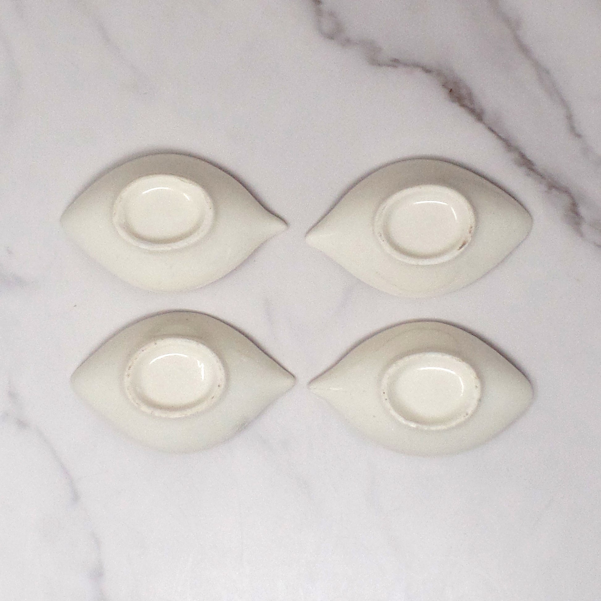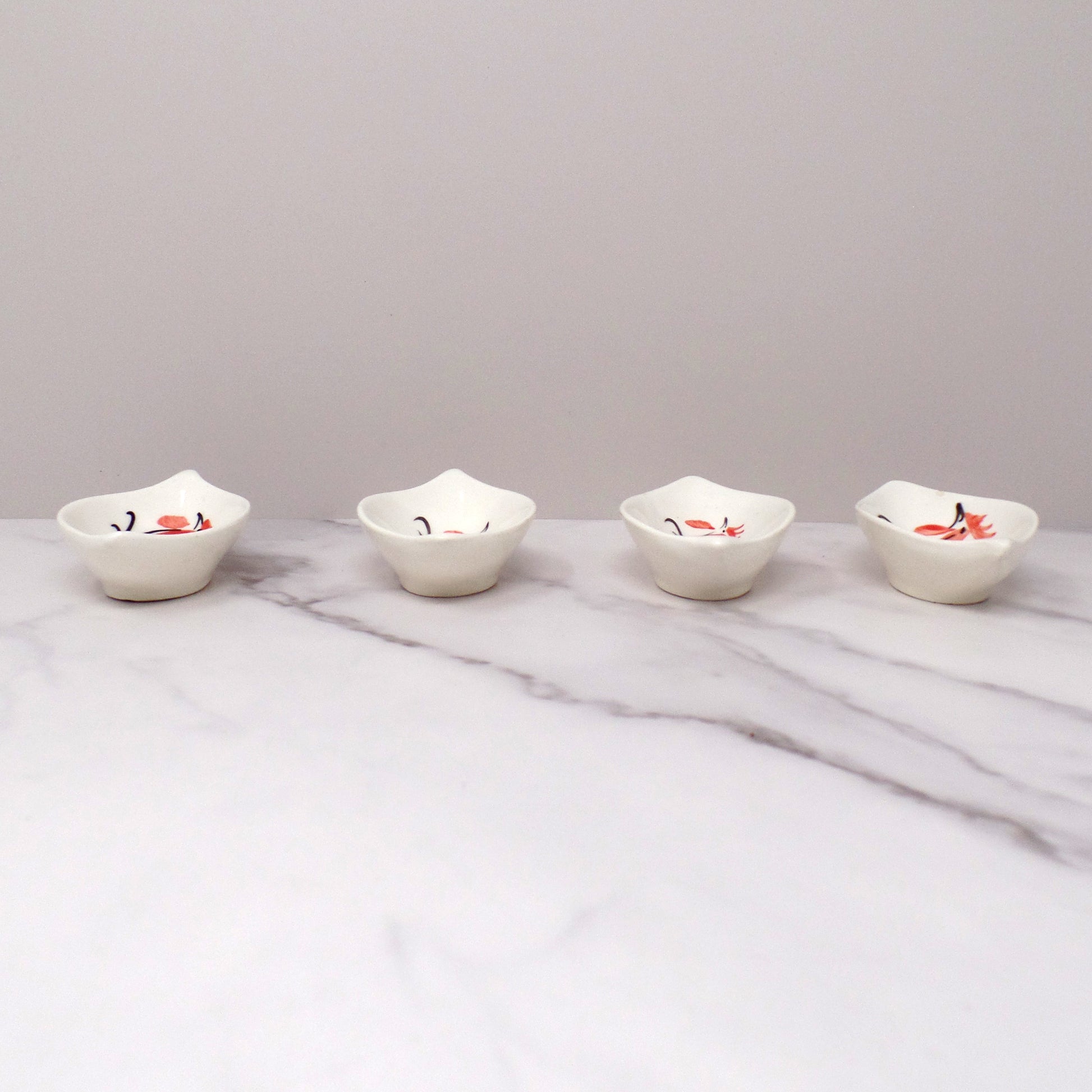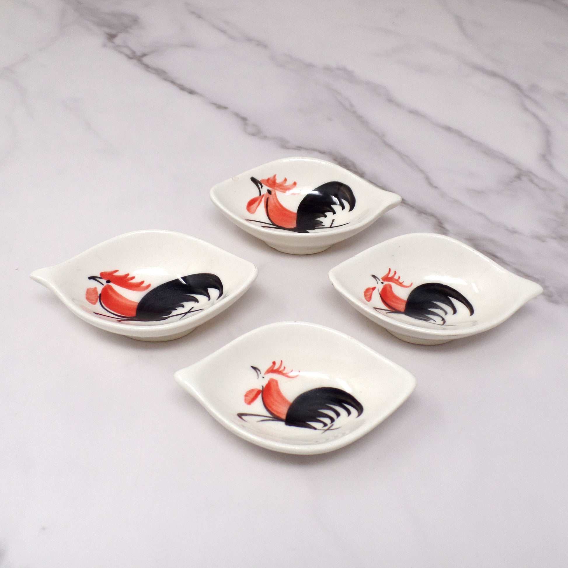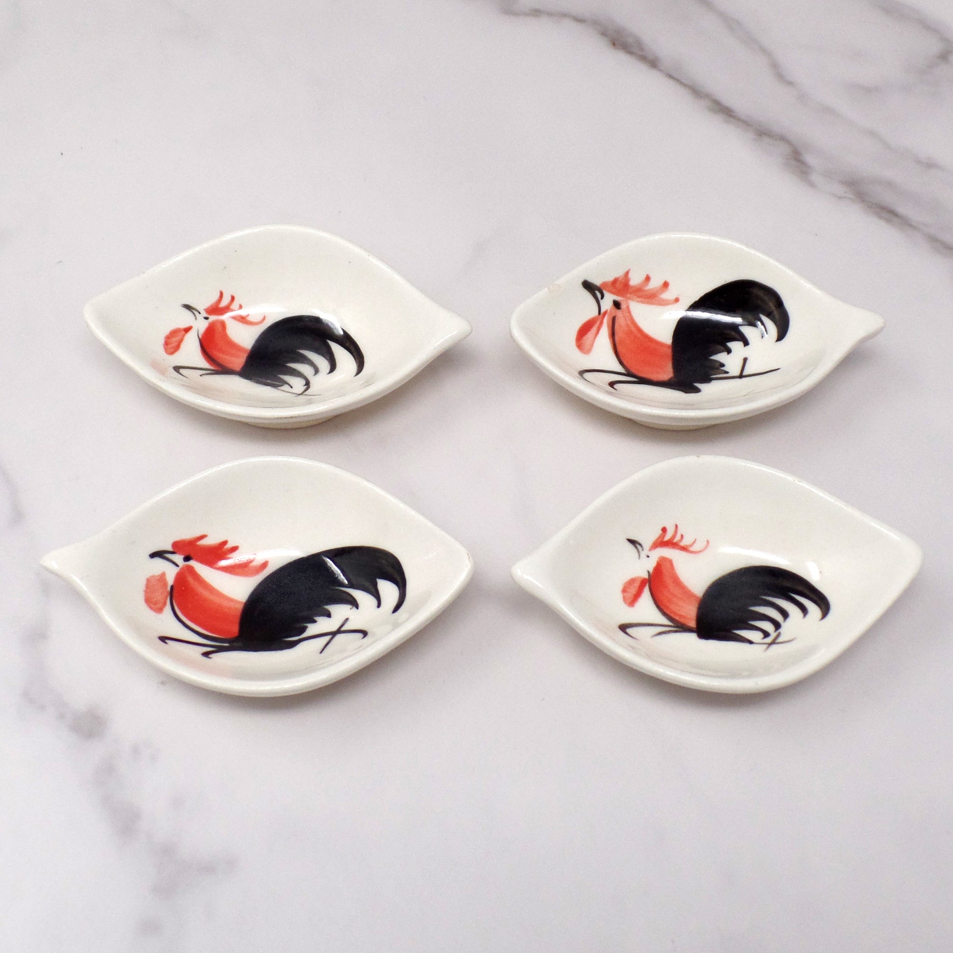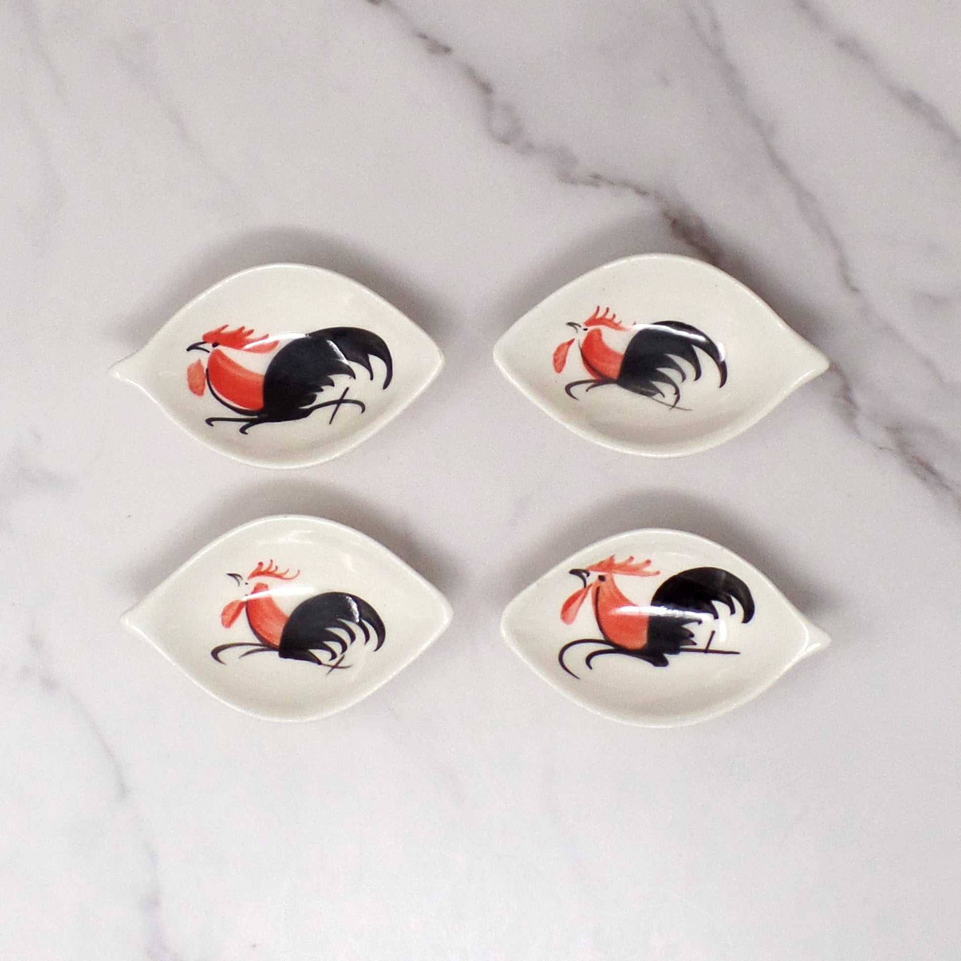 Set of four small almond-shaped ceramic hand-painted condiment bowls with rooster design. Unmarked, but most likely made in Japan in the 1950s. Good vintage condition overall: There are some small fleabites / rough spots along edges. One bowl has larger chip on top edge and a line on the bottom that appears to be a surface mark, not a crack (see detail photos). Some crazing on the glaze.