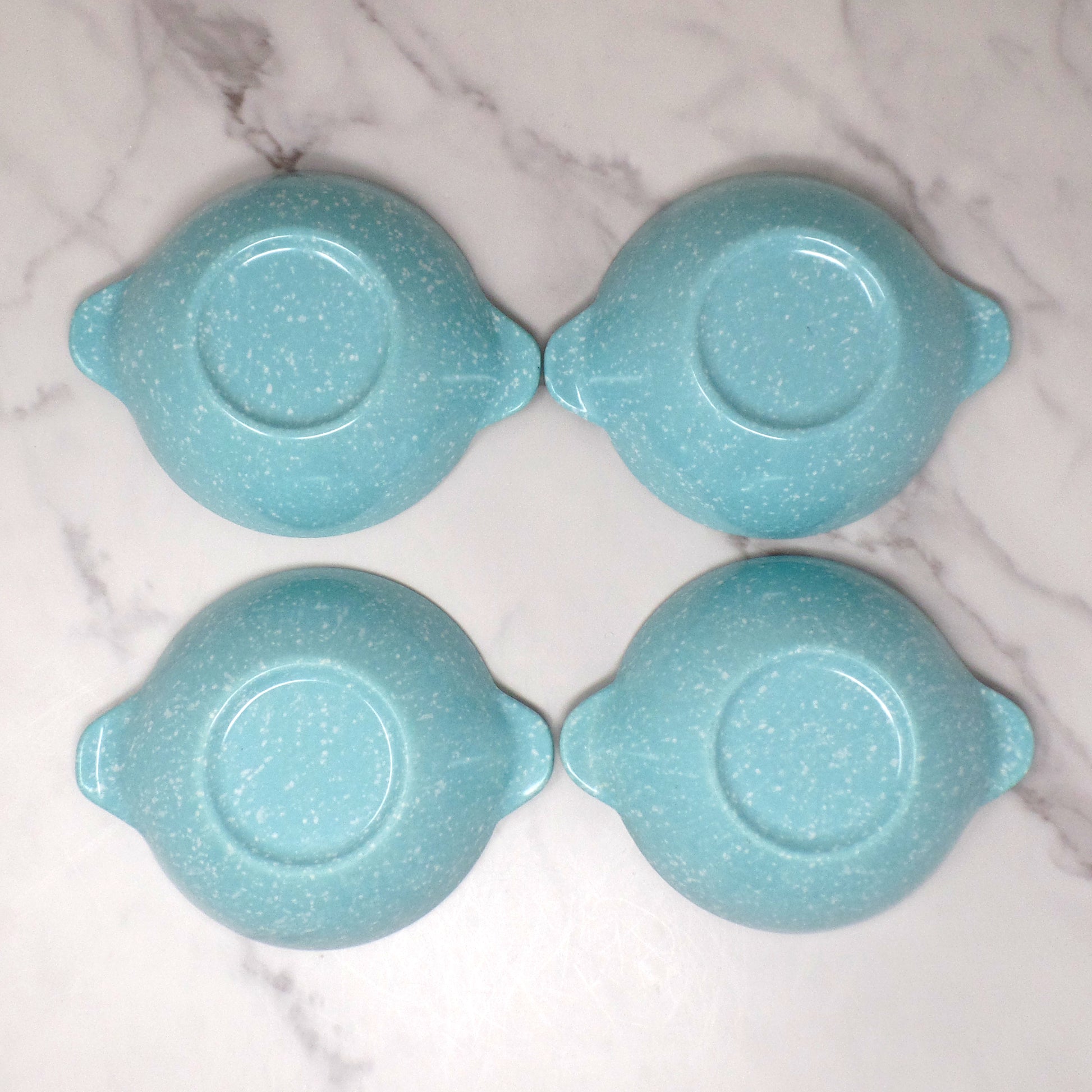 Vintage Joan Luntz Gaiety Melmac / Melamine 5-1/2” Handled Bowl, Speckled Turquoise - set of 4 (1950s)