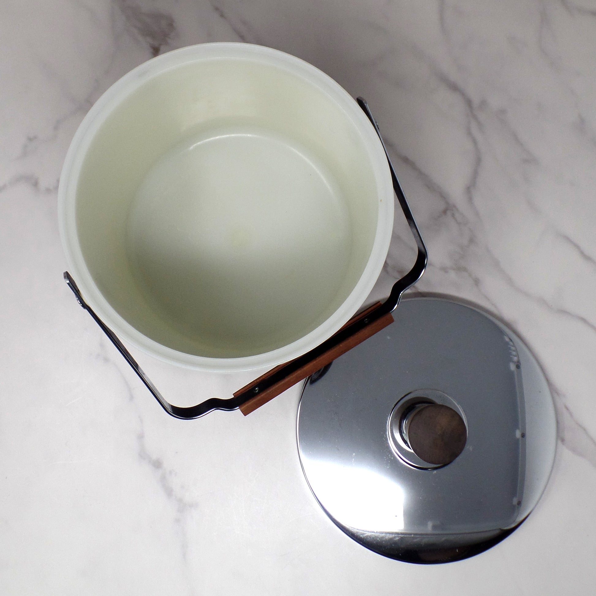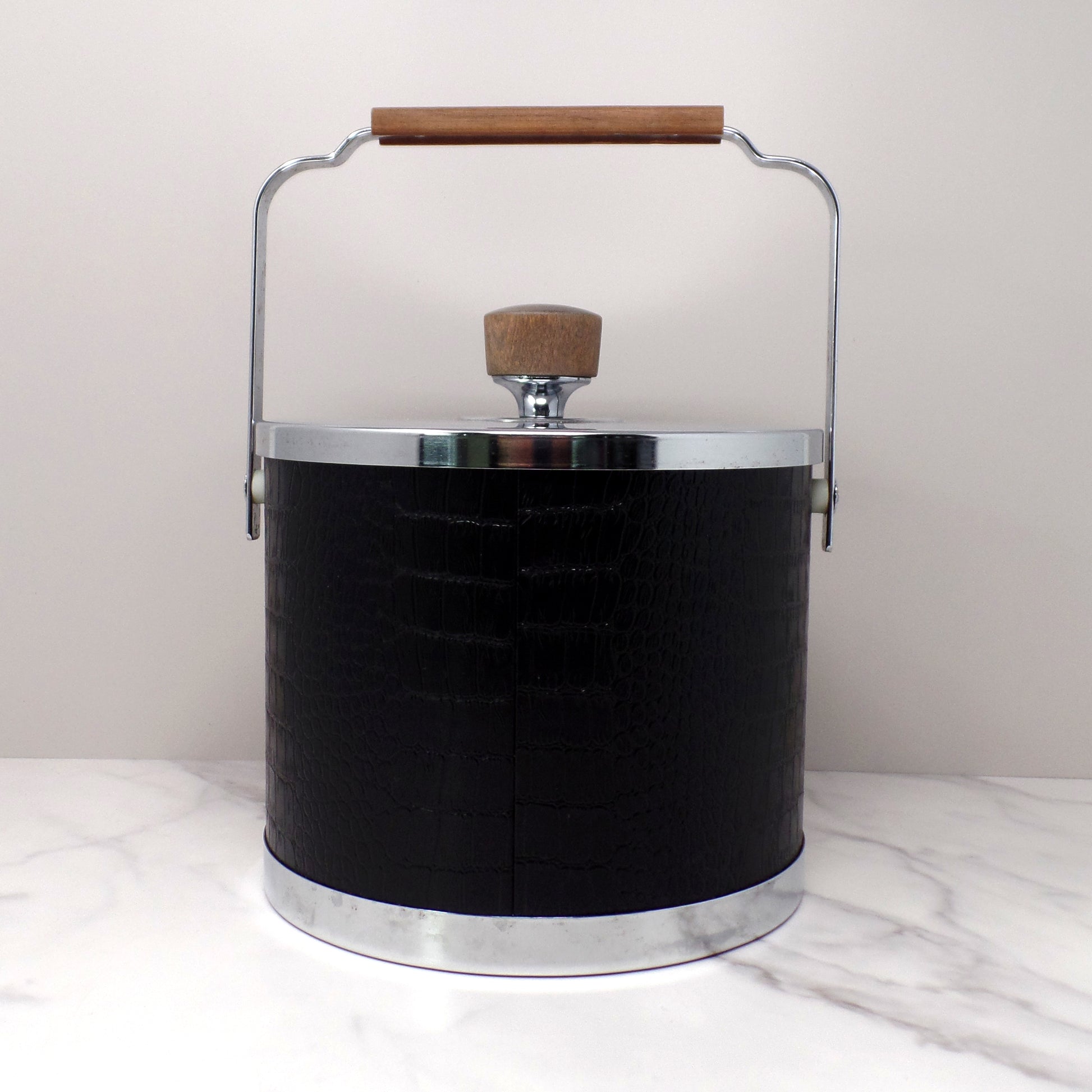 Vintage mid-century modern Kromex black faux alligator skin and chrome ice bucket with wood handle and knob. Made in the USA, c 1960. Good vintage condition.