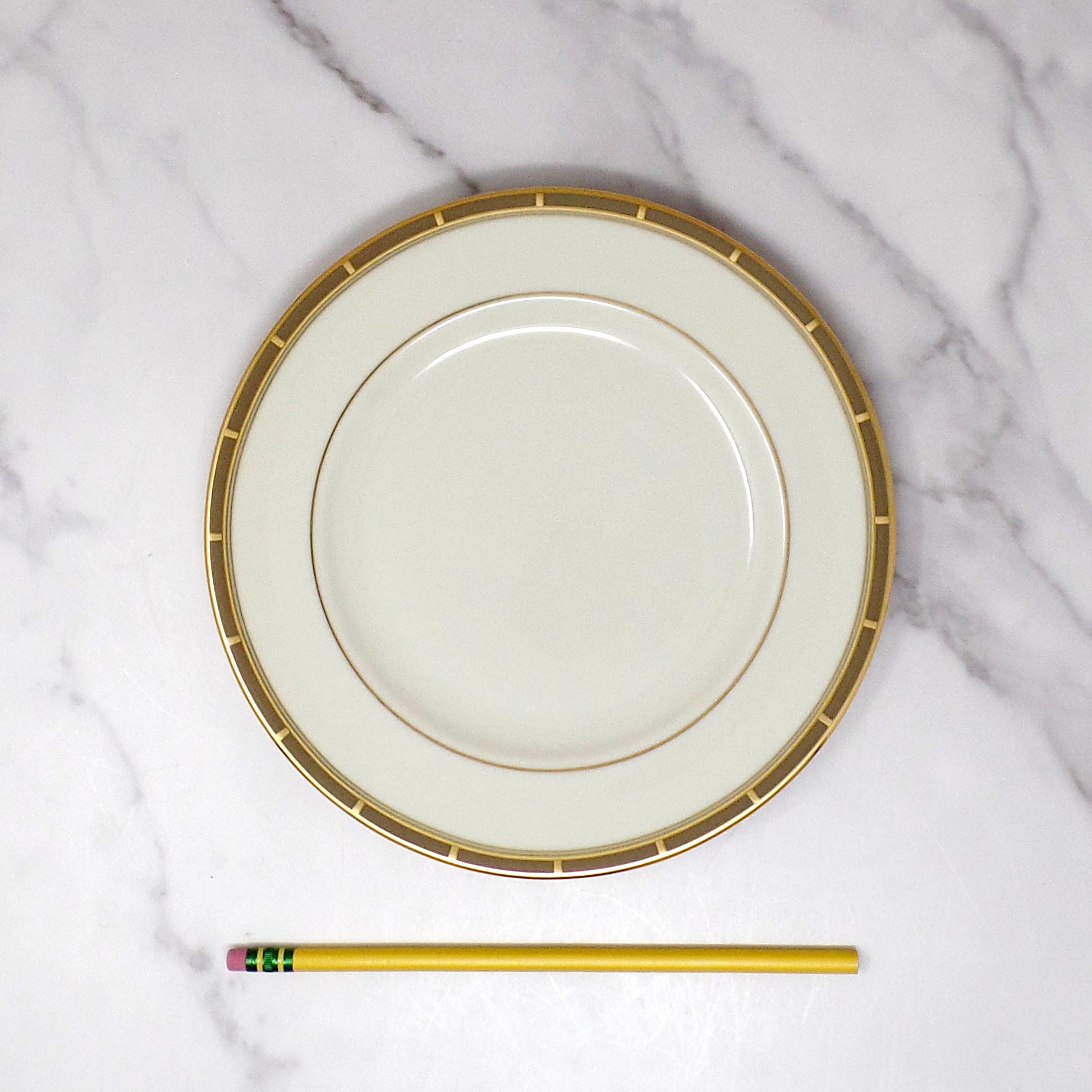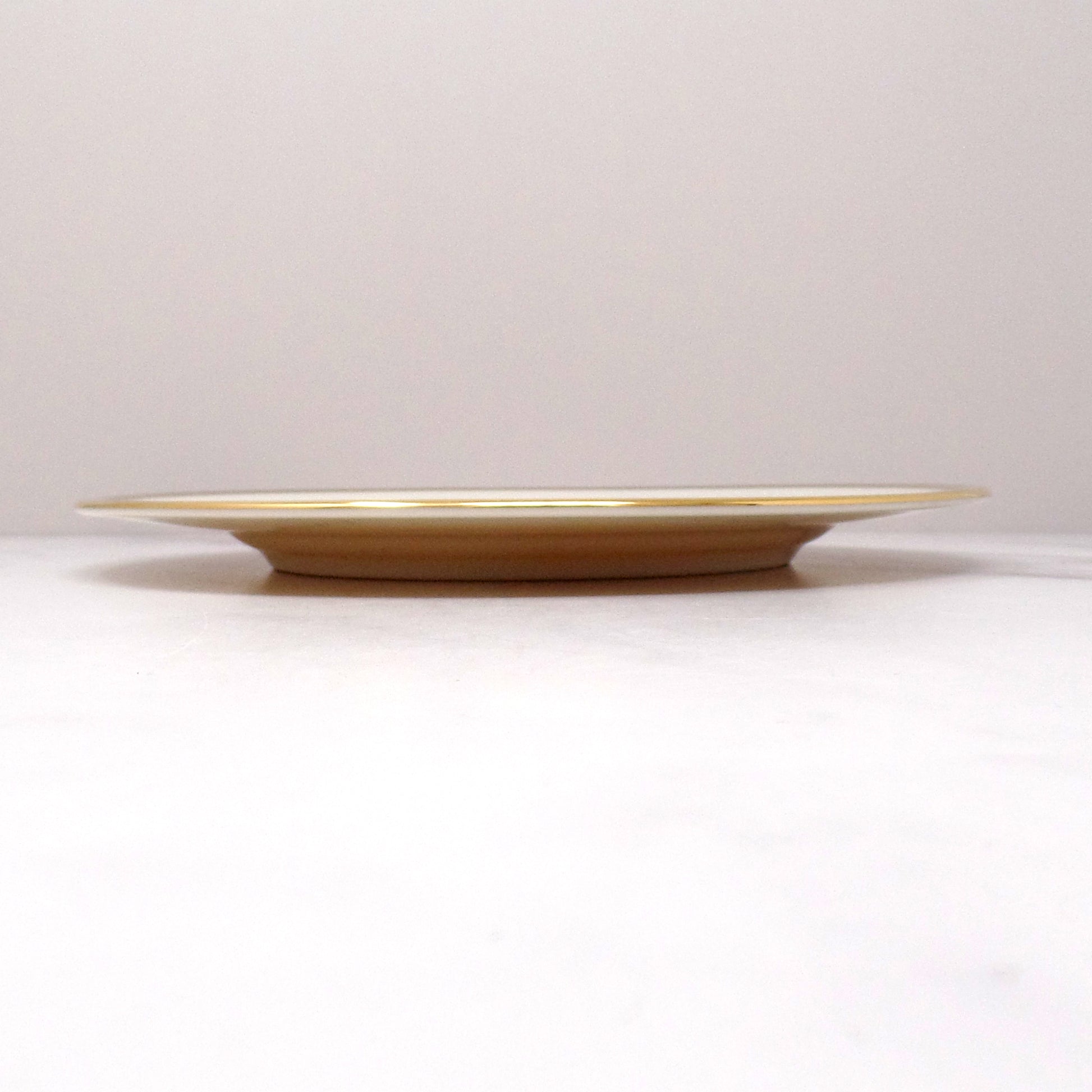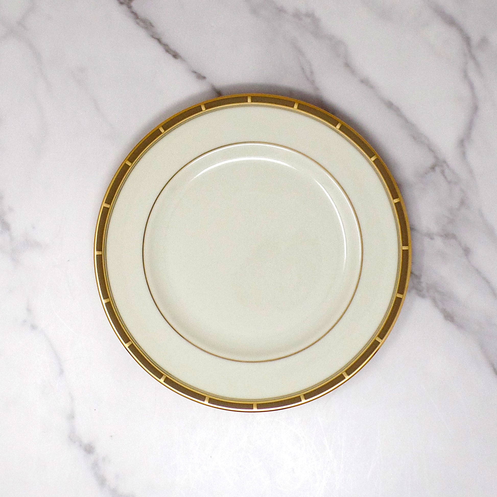 Vintage bone china salad plate from Lenox in the Desert Vista pattern. Beautiful ivory/cream colored base with gold and taupe banding. Exact production date is unknown, but this pattern was made in the USA by Lenox from 2005-2008. Very good vintage condition showing very little use or wear.