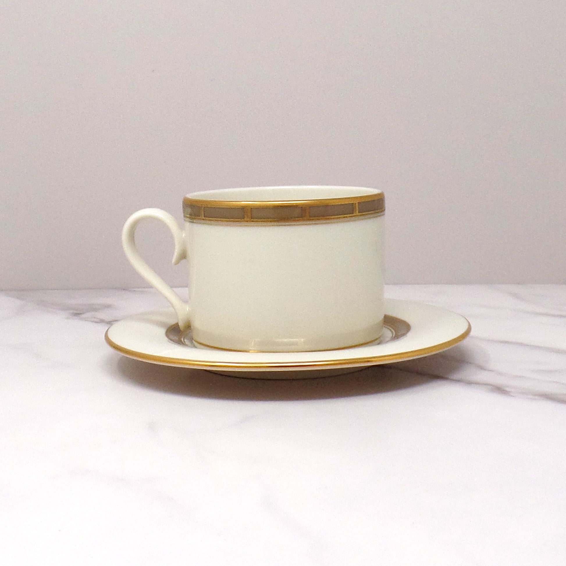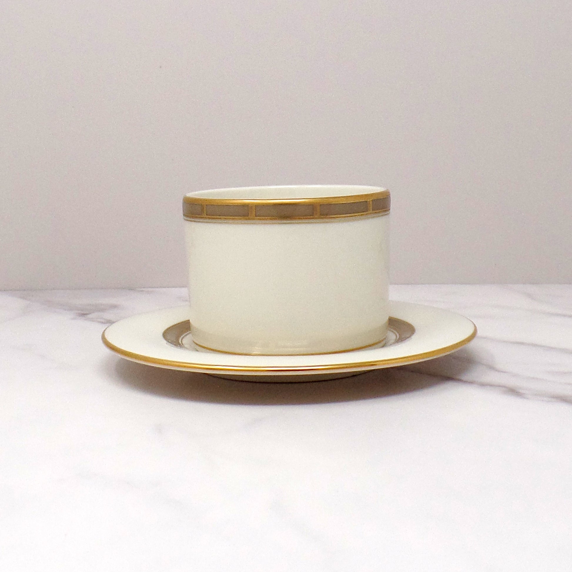 Vintage bone china flat cup and saucer from Lenox in the Desert Vista pattern. Beautiful ivory/cream colored base with gold and taupe banding. Exact production date is unknown, but this pattern was made in the USA by Lenox from 2005-2008. Very good vintage condition showing very little use or wear.