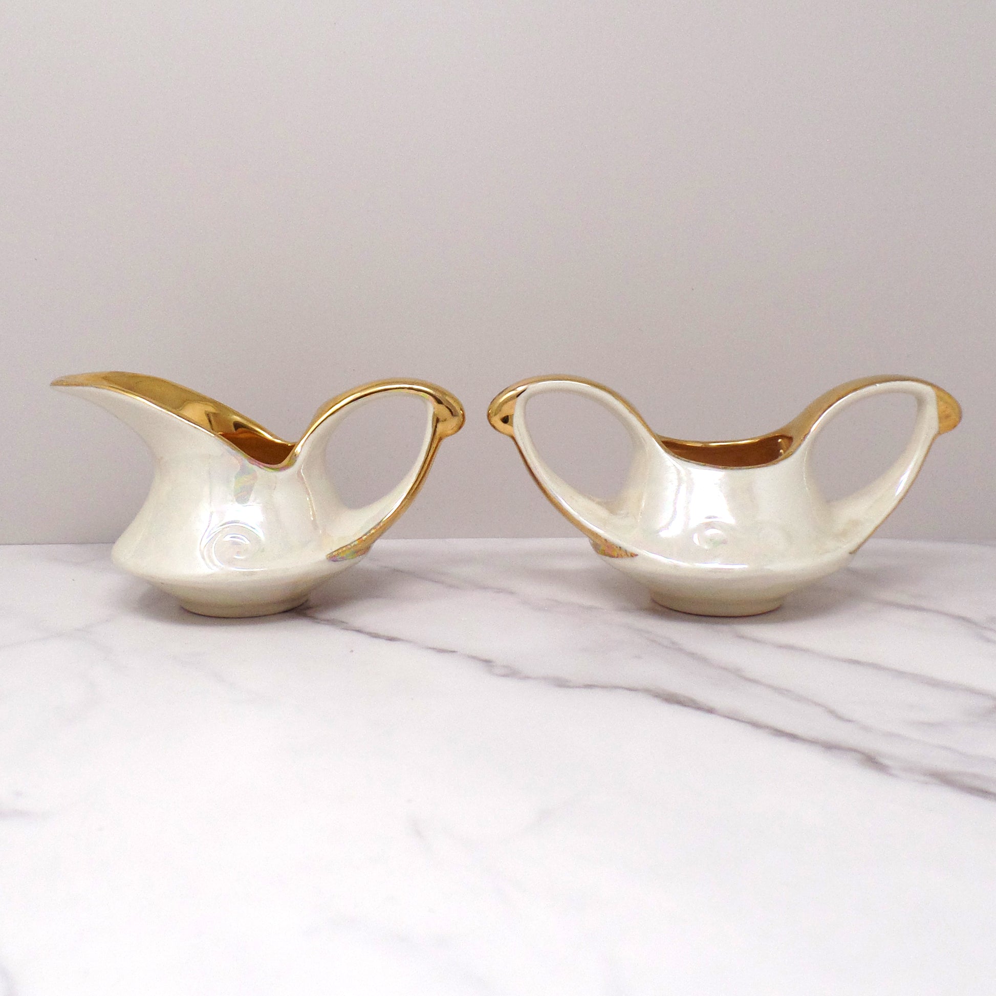 Vintage mid-century modern iridescent ceramic cream and gold cream and sugar set from Pearl China Co. made in the 1950s-1960s. Good vintage condition, with a few spots of gold rubbed off the corners of handles (see detail photo). Made in the USA.