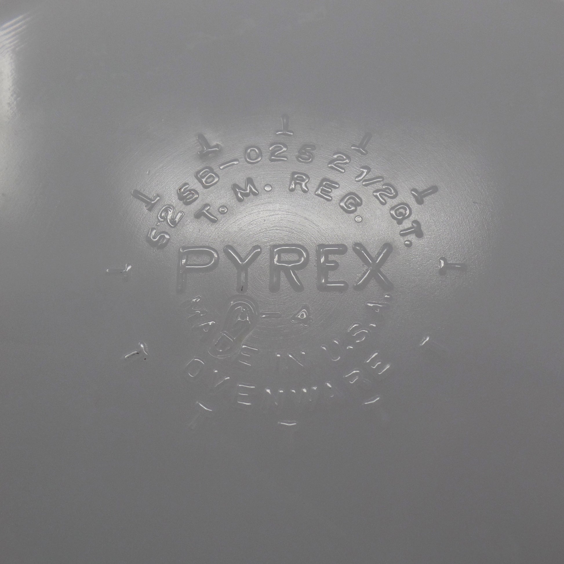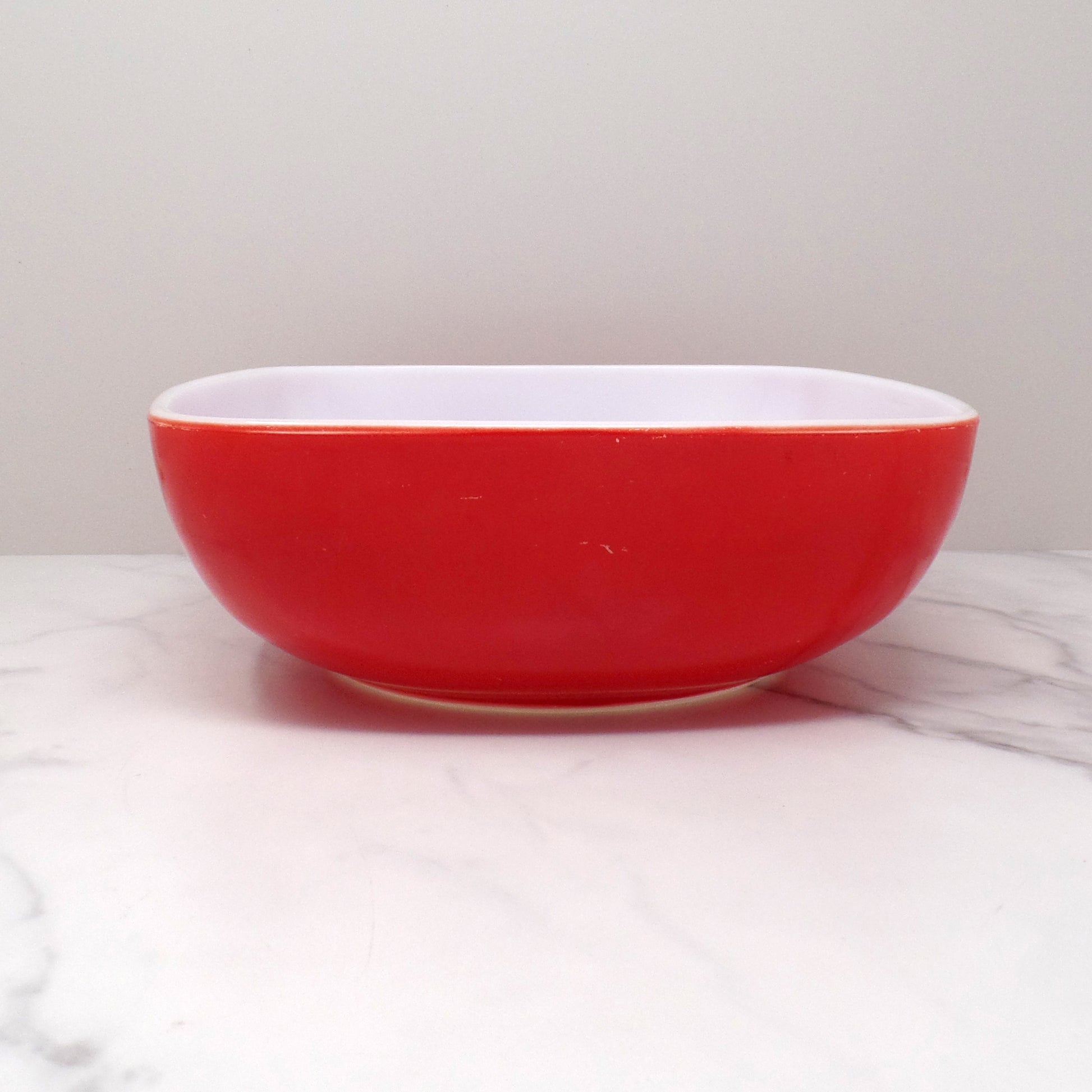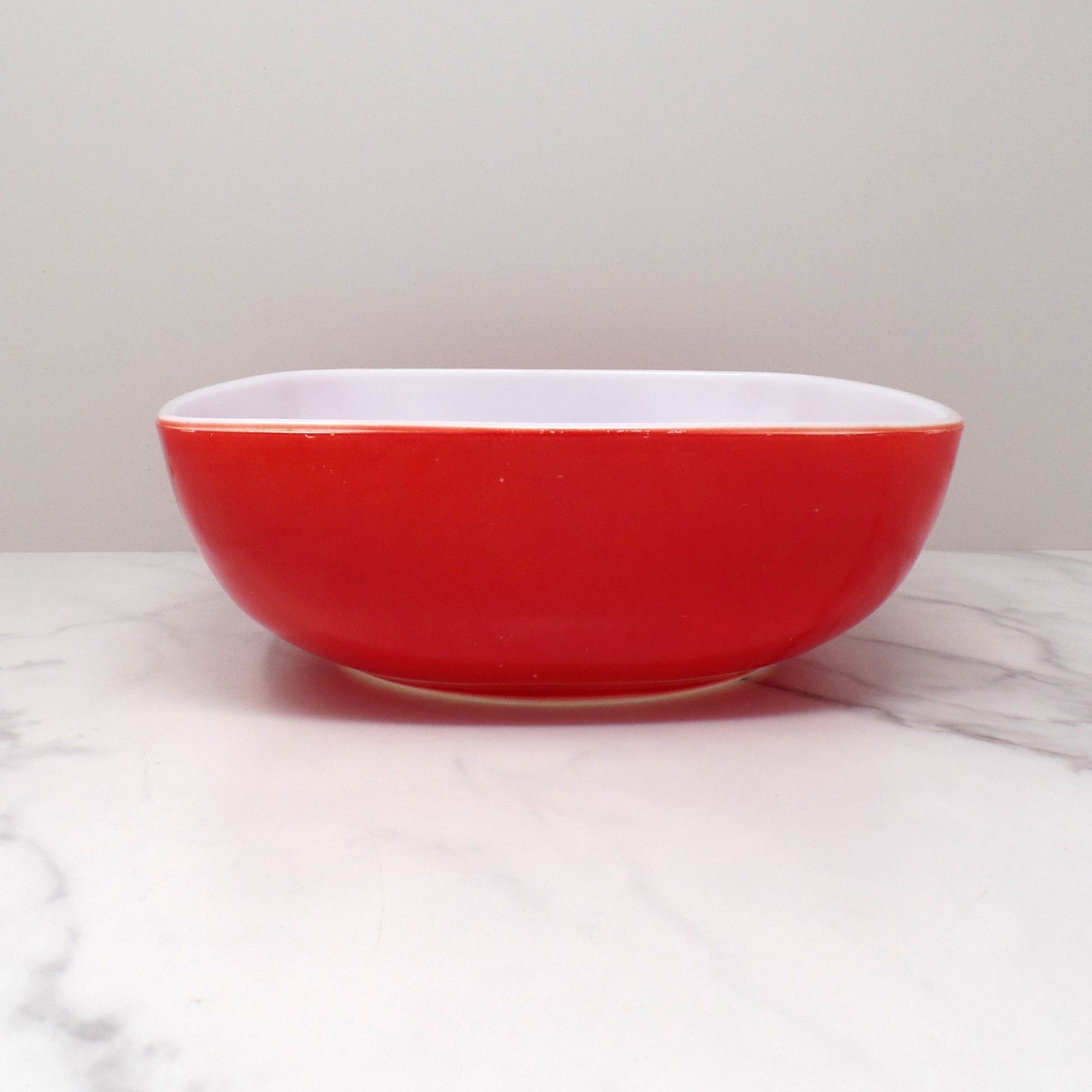 Vintage Pyrex glass 2 1/2 Qt square hostess bowl (model 525B-035) in solid red. Made in the USA in the time period of 1949-59 (based on the backstamp). It is in good vintage condition: there are some areas where red has scratched off on outside (see detail photo). Very few scratches inside, however, and no utensil marks, chips, or cracks.