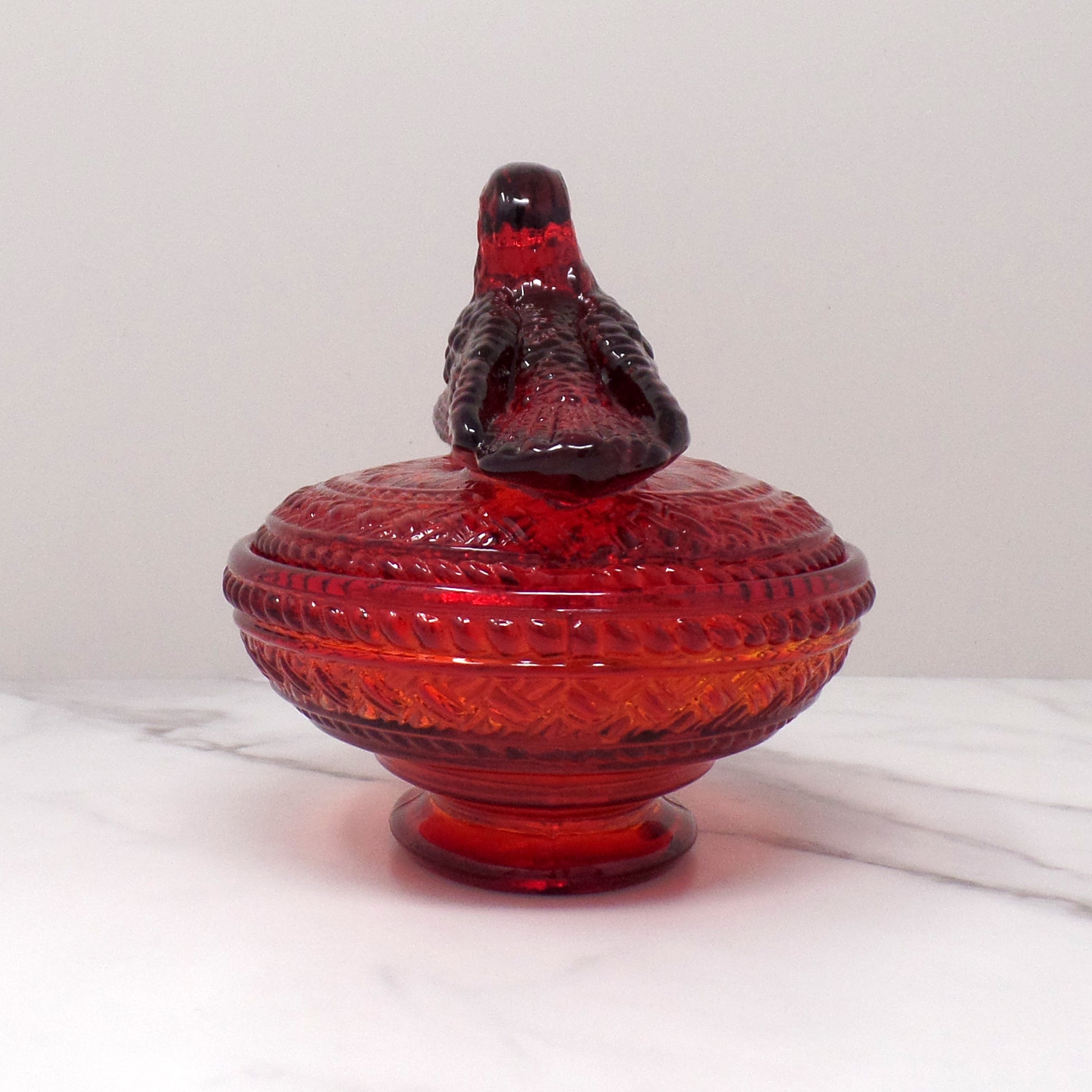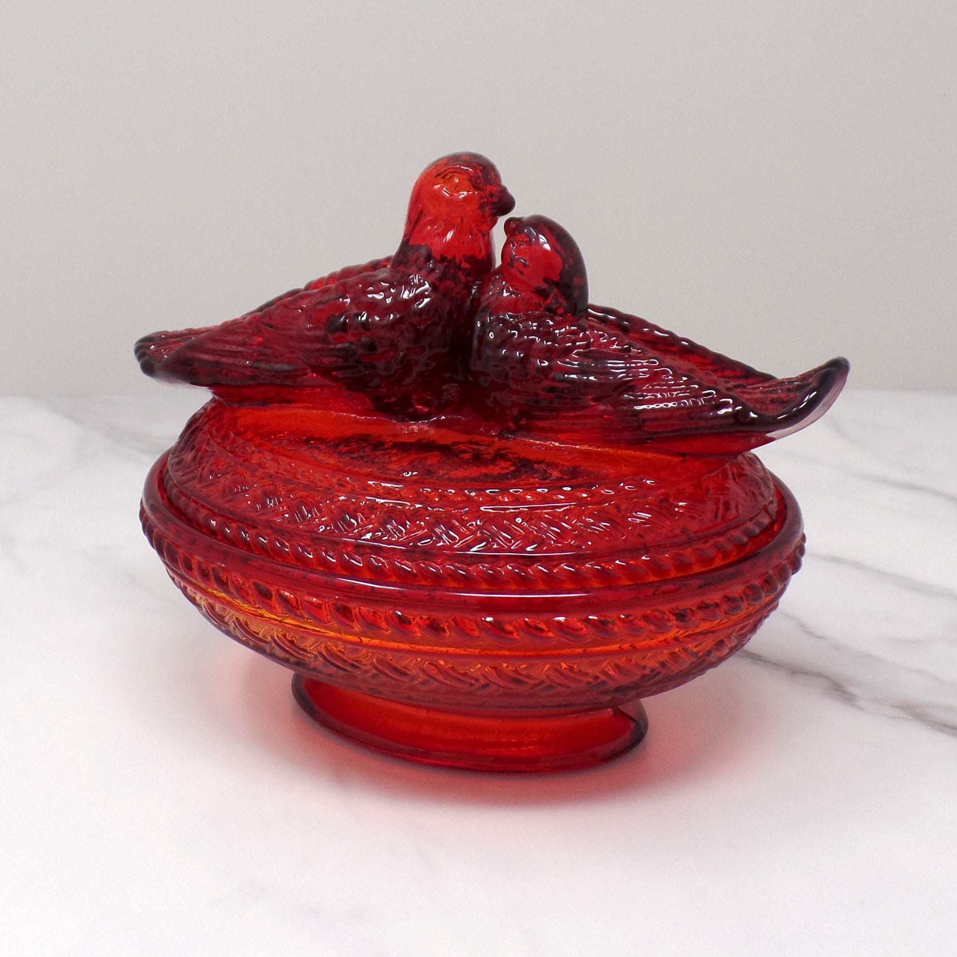 Vintage Viking Ruby Red Glass Lovebirds on Nest Candy Dish (1960s)